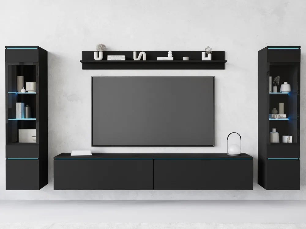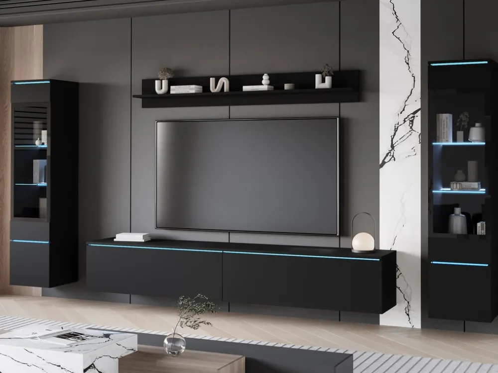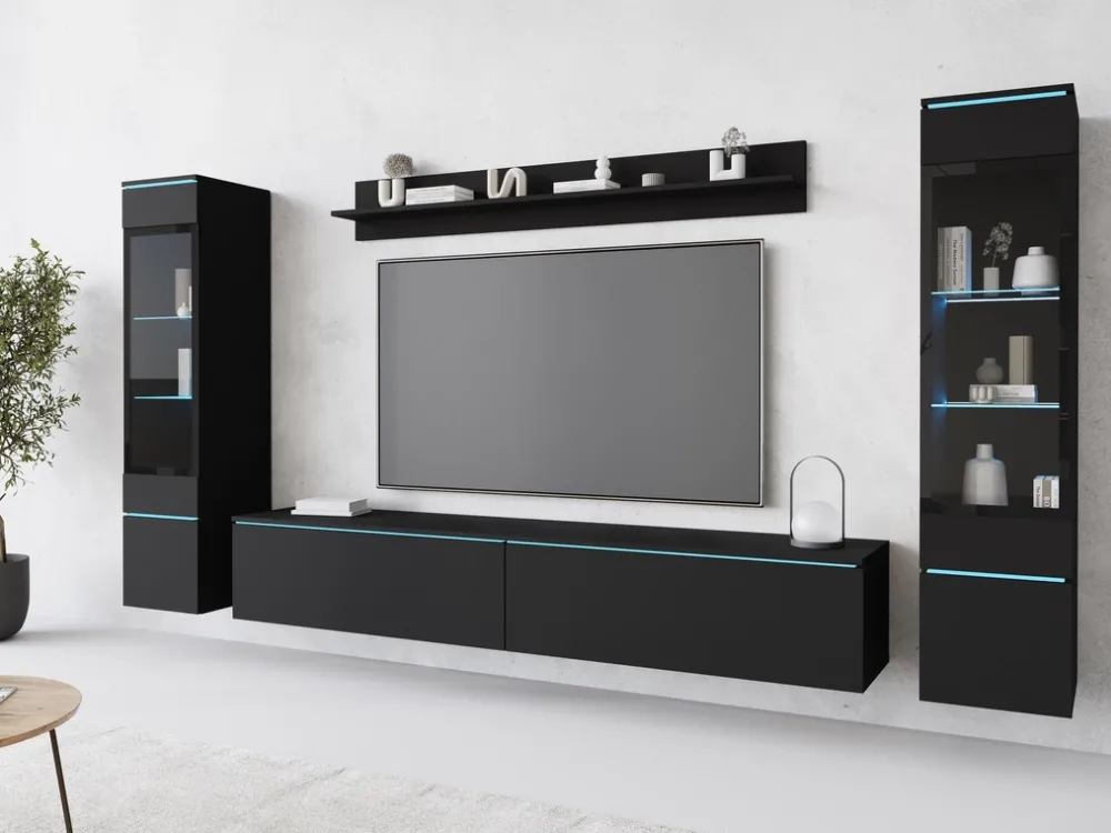 Unikalną cechą meblościanki jest możliwość montażu zarówno w wersji stojącej, jak i wiszącej. To pozwala na łatwą adaptację do każdego wnętrza i stylu życia, oferując swobodę w aranżacji przestrzeni. Wykonana z materiałów najwyższej jakości, nie tylko wyróżnia się trwałością, ale również stanowi wyrafinowany akcent dekoracyjny, podkreślający nowoczesny charakter wnętrza.