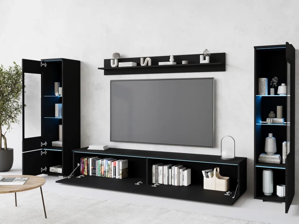 Centralnym elementem jest szafka RTV z dwoma uchylnymi frontami, które zapewniają łatwy dostęp do niezbędnych akcesoriów, które chcemy trzymać w ukryciu. Obok znajdują się dwie eleganckie witryny, idealne do eksponowania ulubionych dekoracji czy zbiorów. Ich szklane fronty dodają lekkości i nowoczesnego charakteru, jednocześnie pozwalając na subtelne wyeksponowanie zawartości.