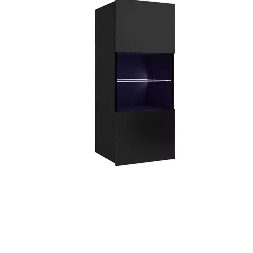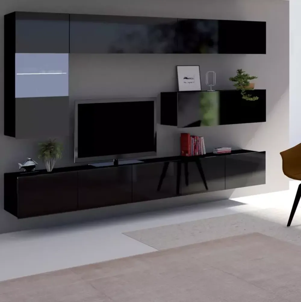 Zestaw mebli MODERN w ciepłym odcieniu czarny połysk to idealna propozycja do nowoczesnego salonu, który łączy styl z funkcjonalnością. Dzięki przemyślanemu układowi elementów i nowoczesnemu wykończeniu bez uchwytów, zestaw doskonale wpisuje się w aktualne trendy wnętrzarskie. W jego skład wchodzą: jedna witryna wisząca, trzy poziome szafki wiszące oraz dwie szafki RTV o szerokościach 100 cm i 150 cm.
