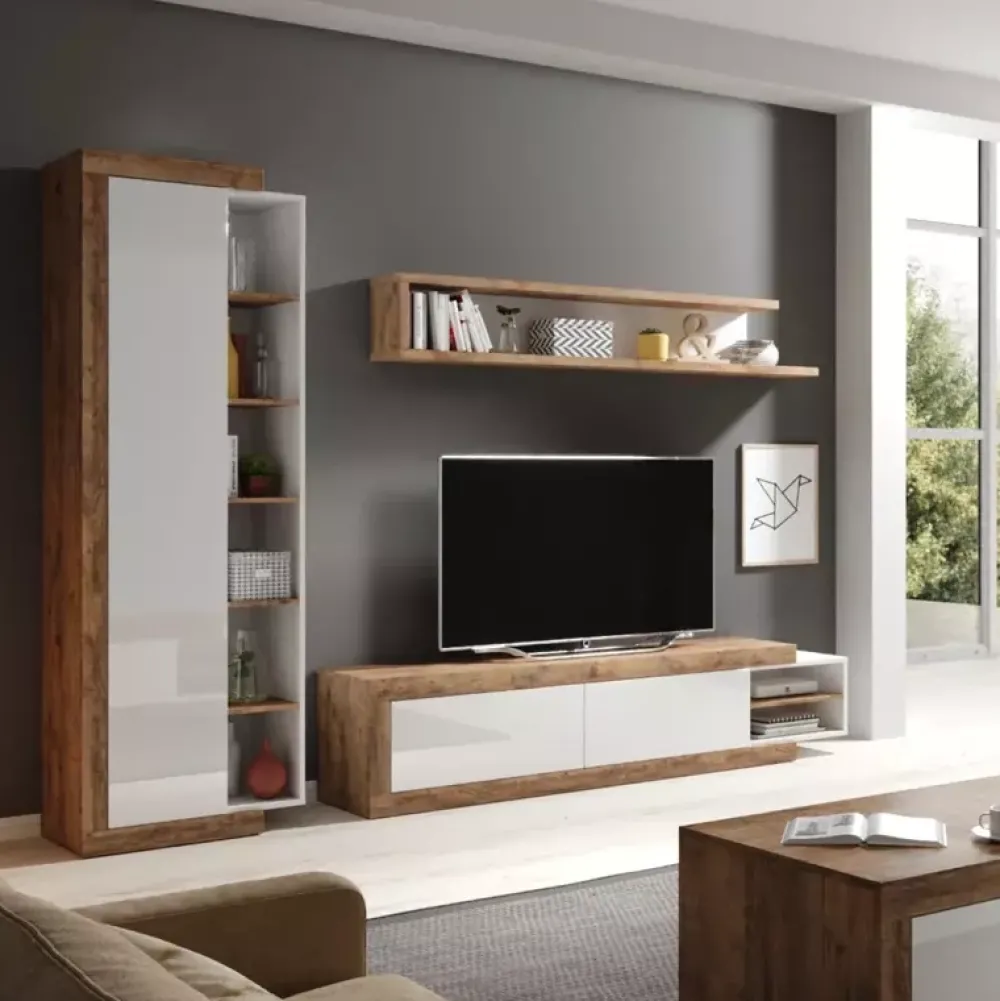 - Elegancka meblościanka skłądająca się z regału stojącego, półki wiszącej oraz rozsuwanej szafki rtv.