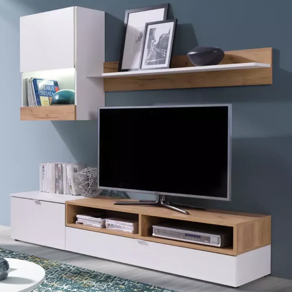 Nowoczesna meblościanka RICO to Nasze rozwiązanie dla osób poszukujących tanich mebli do salonu o niewielkich rozmiarach. Meblościanka ma 175 cm szerokości, a w jej skład wchodzą: wisząca witryna do salonu, którą można podświetlić nadającym przyjazny klimat oświetleniem LED a ono pozwoli Ci wyeksponować kolekcję kieliszków, czy też pamiątki z rodzinnych wakacji. Dodatkowo w witrynie zastosowano system PUSH CLICK; Szafka pod telewizor wyposażona w dwie półki na sprzęt RTV i dwie zamykane szafki – uchylane do dołu; Półka o szerokości 120 cm do zawieszenia nad telewizorem.