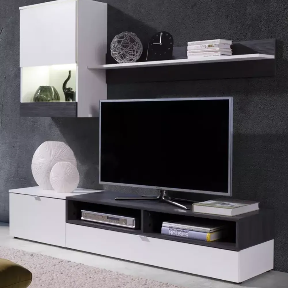 Nowoczesna meblościanka RICO to Nasze rozwiązanie dla osób poszukujących tanich mebli do salonu o niewielkich rozmiarach. Meblościanka ma 175 cm szerokości, a w jej skład wchodzą: wisząca witryna do salonu, którą można podświetlić nadającym przyjazny klimat oświetleniem LED a ono pozwoli Ci wyeksponować kolekcję kieliszków, czy też pamiątki z rodzinnych wakacji. Dodatkowo w witrynie zastosowano system PUSH CLICK; Szafka pod telewizor wyposażona w dwie półki na sprzęt RTV i dwie zamykane szafki – uchylane do dołu; Półka o szerokości 120 cm do zawieszenia nad telewizorem.