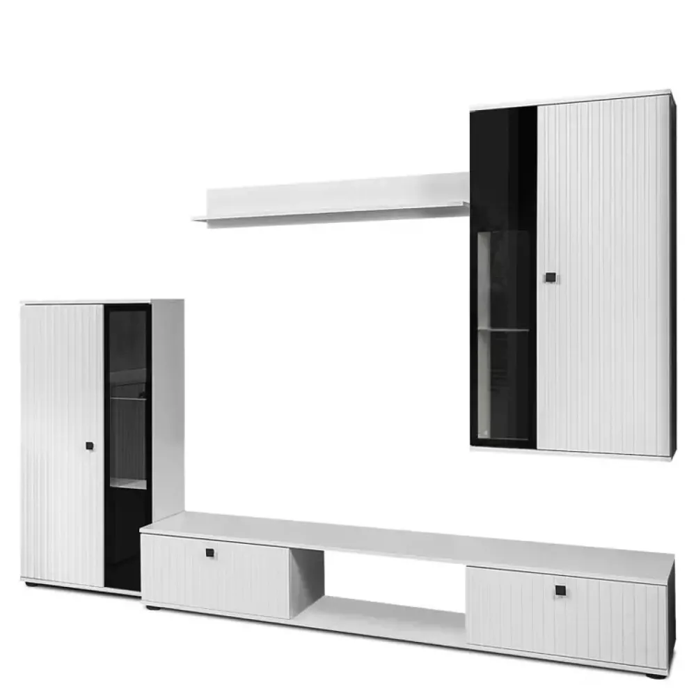 - Meblościanka do salonu KUBA składa się z brył, których fronty wykonano z płyty MDF z widocznymi frezami. Bryły znajdujące się w meblościance posiadają uchwyty wykonane z metalu w czarnym kolorze, które dodają jej dodatkowych, eleganckich akcentów.