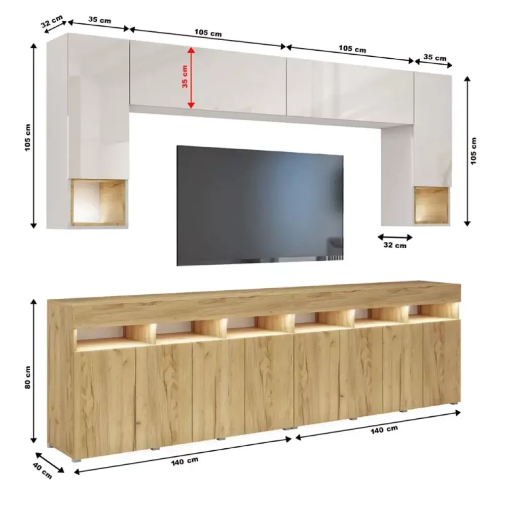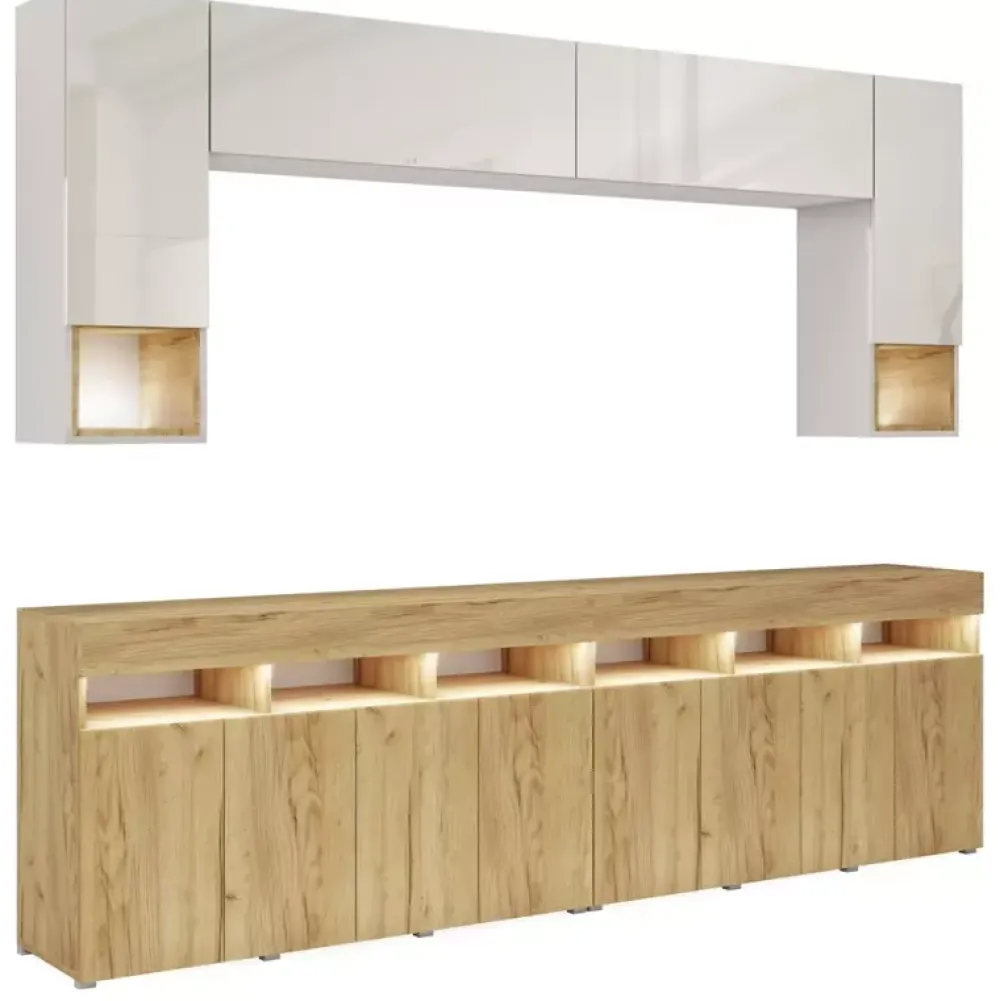 - Oświetlenie LED – Komoda oraz szafka posiadają możliwość doposażenia w dedykowane oświetlenie LED, które znajduje się w zakładce „Kup razem” pod galerią zdjęć. Aby wyposażyć meble w dedykowane oświetlenie LED, prosimy dodać do koszyka zestaw dwóch, oraz 2x zestaw trzech lampek podszafkowych.
