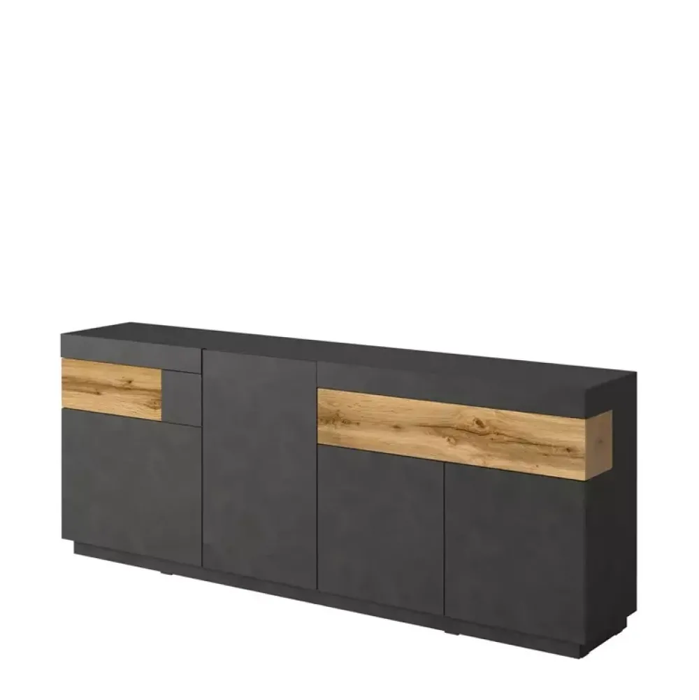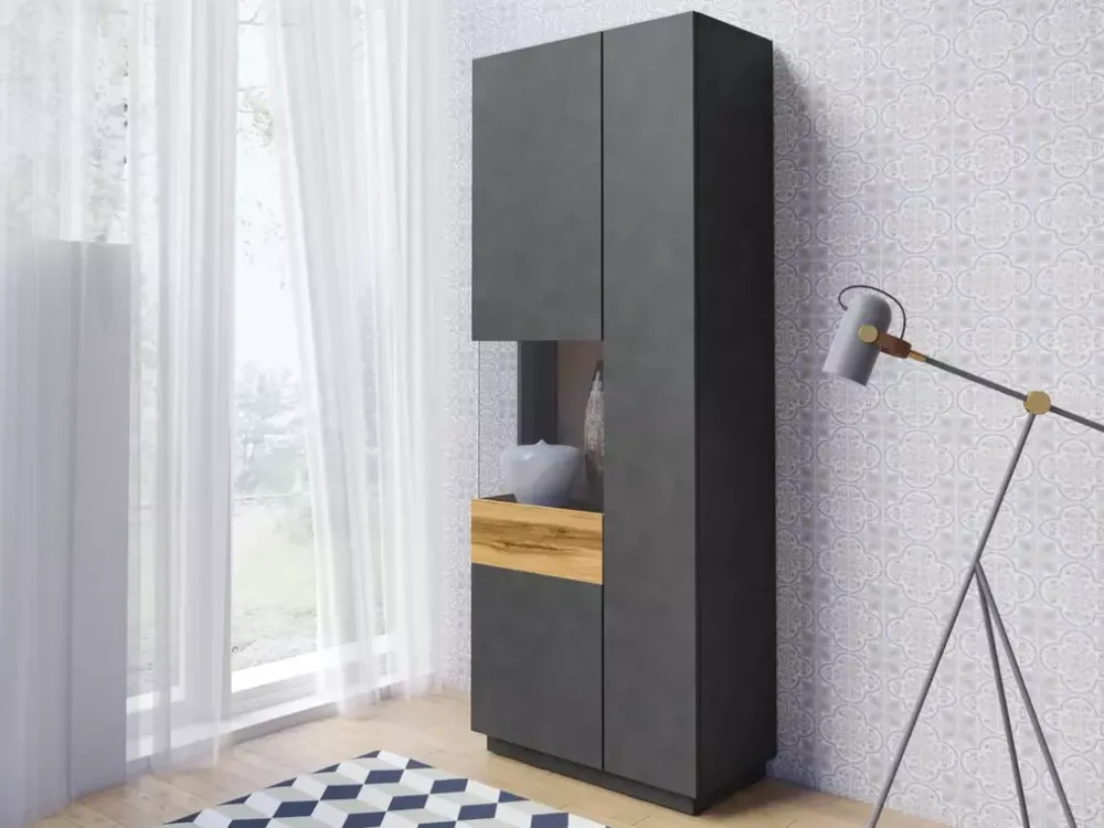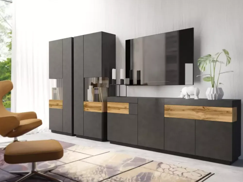 KOBE to eleganckie meble do salonu o minimalistycznej stylistyce i charakterystycznym wykończeniu. Dostępne bryły pozwolą państwu zaaranżować nowoczesny i funkcjonalny salon. Seria składa się z komód oraz witryn, które występują w trzech wariantach kolorystycznych takich jak biały połysk z wstawkami w kolorze dąb wotan, biały połysk i wstawki z industrialnym betonem czy matowa matera z wstawkami koloru dąb wotan. Kolekcja została wyprodukowana zgodnie z normami europejskimi przy użyciu wysokiej jakości materiałów jak płyta MDF oraz nowoczesnych i precyzyjnych technologii, co przekłada się na trwałość mebli. Takie meble są podstawą wyposażenia salonu do którego chętnie się wraca..