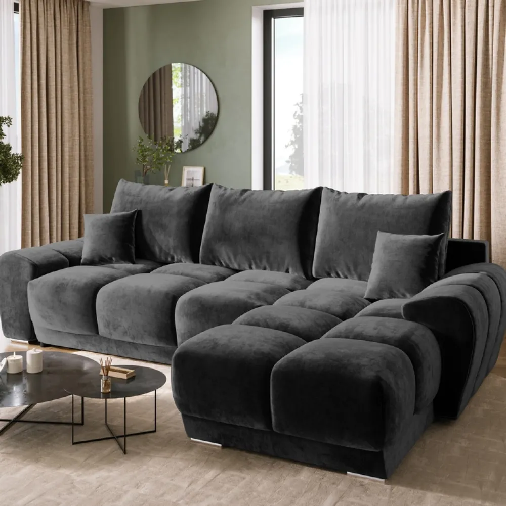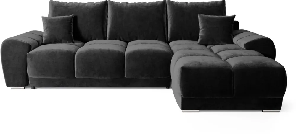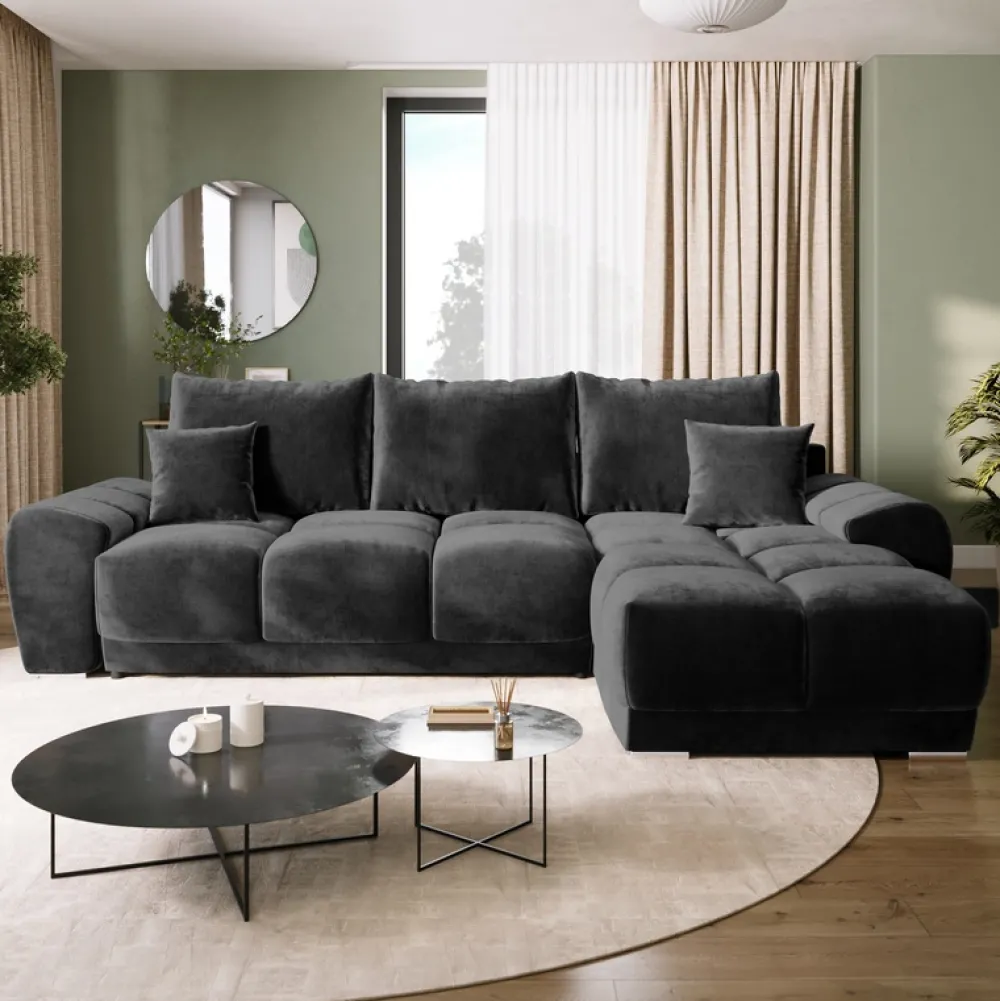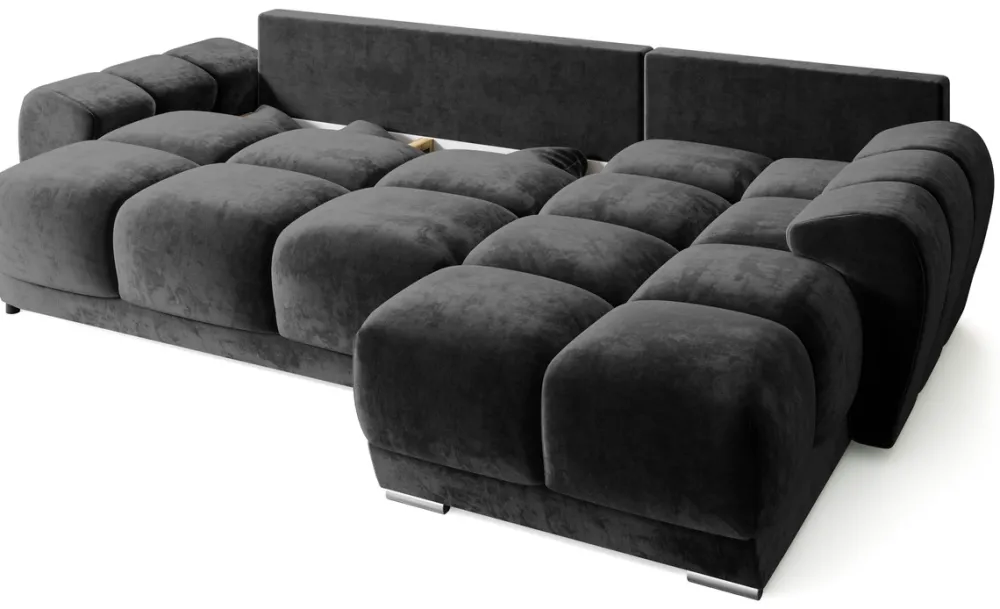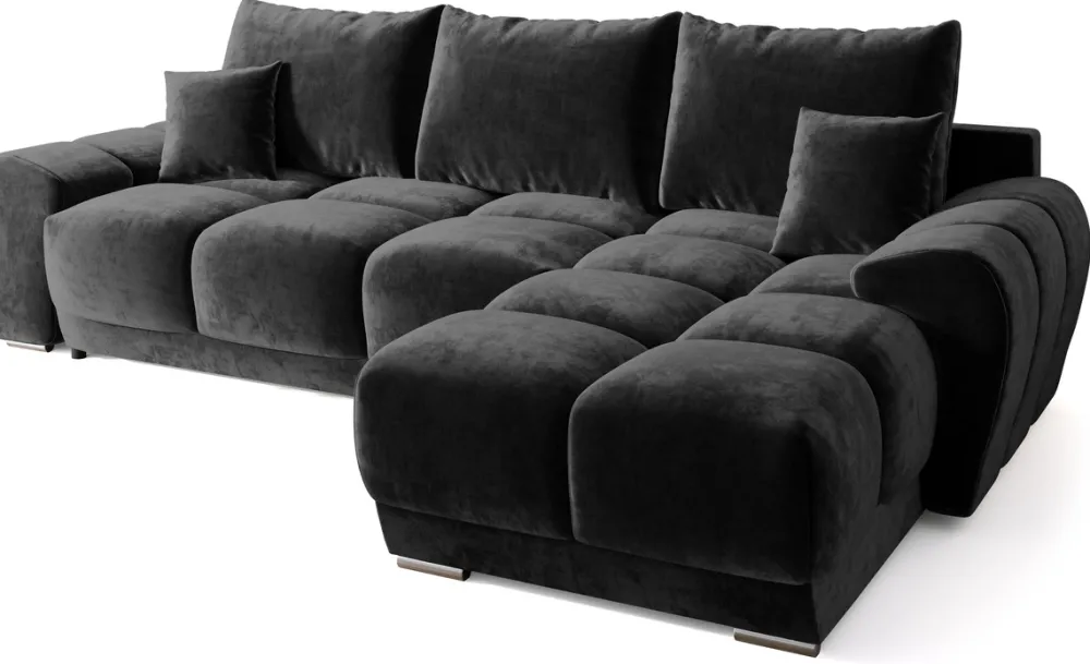 - Czarny narożnik z funkcją spania o wymiarach 130×220 cm. Wyposażony w automat DL, który ułatwia rozłożenie funkcji spania, oraz dostęp do pojemnika na pościel. Rogówka dostępna w kilkunastu najpopularniejszych kolekcjach tkanin.