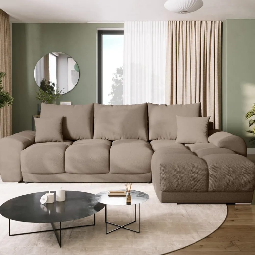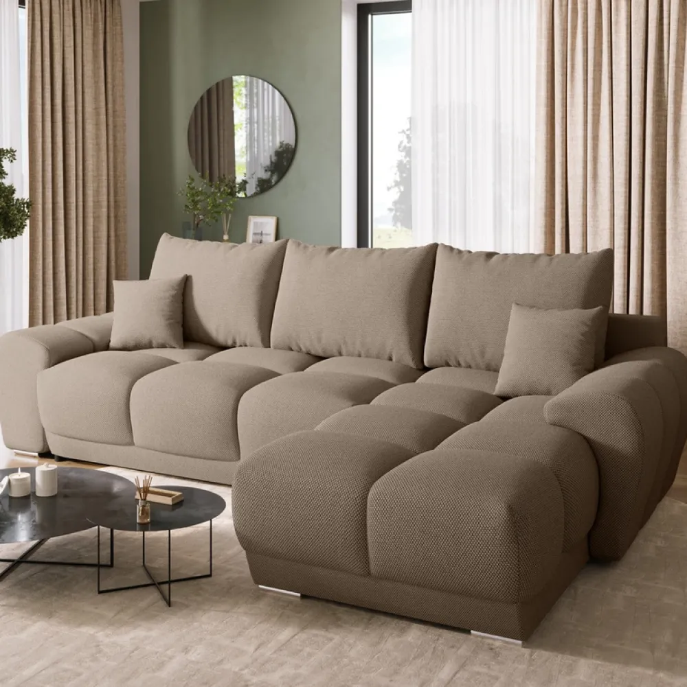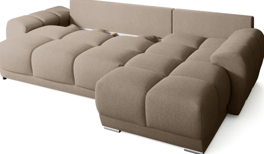 - Brązowy narożnik z funkcją spania o wymiarach 130×220 cm. Wyposażony w automat DL, który ułatwia rozłożenie funkcji spania, oraz dostęp do pojemnika na pościel. Rogówka dostępna w kilkunastu najpopularniejszych kolekcjach tkanin.