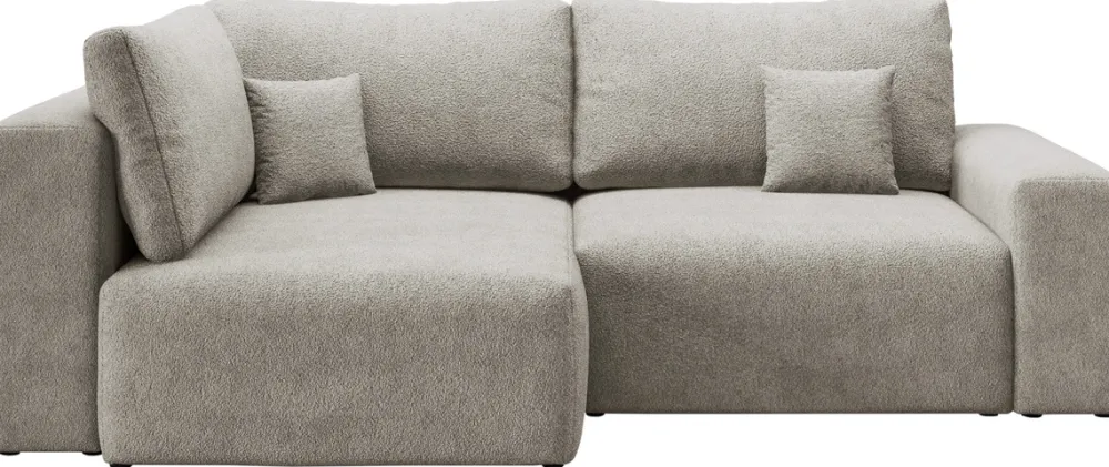 Oprócz funkcjonalności narożnik z funkcją spania CAMILO DUO zachwyca swoją kolorystyką. Tkanina boucle dodaje meblowi subtelnej elegancji, a neutralne kolory tkaniny są łatwe do dopasowania do różnorodnych wnętrz. Komplet trzech dużych poduch oparciowych oraz dwóch mniejszych poduszek zapewnia nie tylko komfort, ale także stanowi stylowe uzupełnienie całości.