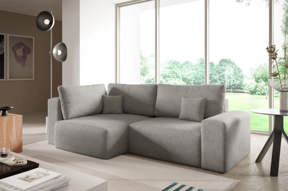 Nowoczesny narożnik z funkcją spania CAMILO DUO to idealne połączenie funkcjonalności i wyjątkowego designu, które wyróżnia się na tle innych mebli. Jest to mebel obity tkaniną boucle, co dodaje mu unikatowego charakteru i tekstury. Idealnie komponuje się zarówno w nowoczesnych, jak i bardziej klasycznych wnętrzach, będąc centralnym punktem salonu.