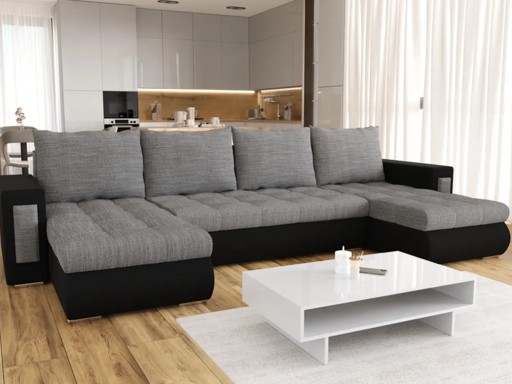 Stwórz idealne miejsce do relaksu z narożnikiem MERLIN U, który łączy nowoczesny design z funkcjonalnością. Jego przestronny kształt w literę U zapewnia dużo miejsca do wypoczynku, a dzięki funkcji spania i pojemnikowi na pościel jest niezwykle praktyczny. Dostępny w dwóch stylowych wersjach kolorystycznych, doskonale dopasuje się do Twojego wnętrza.