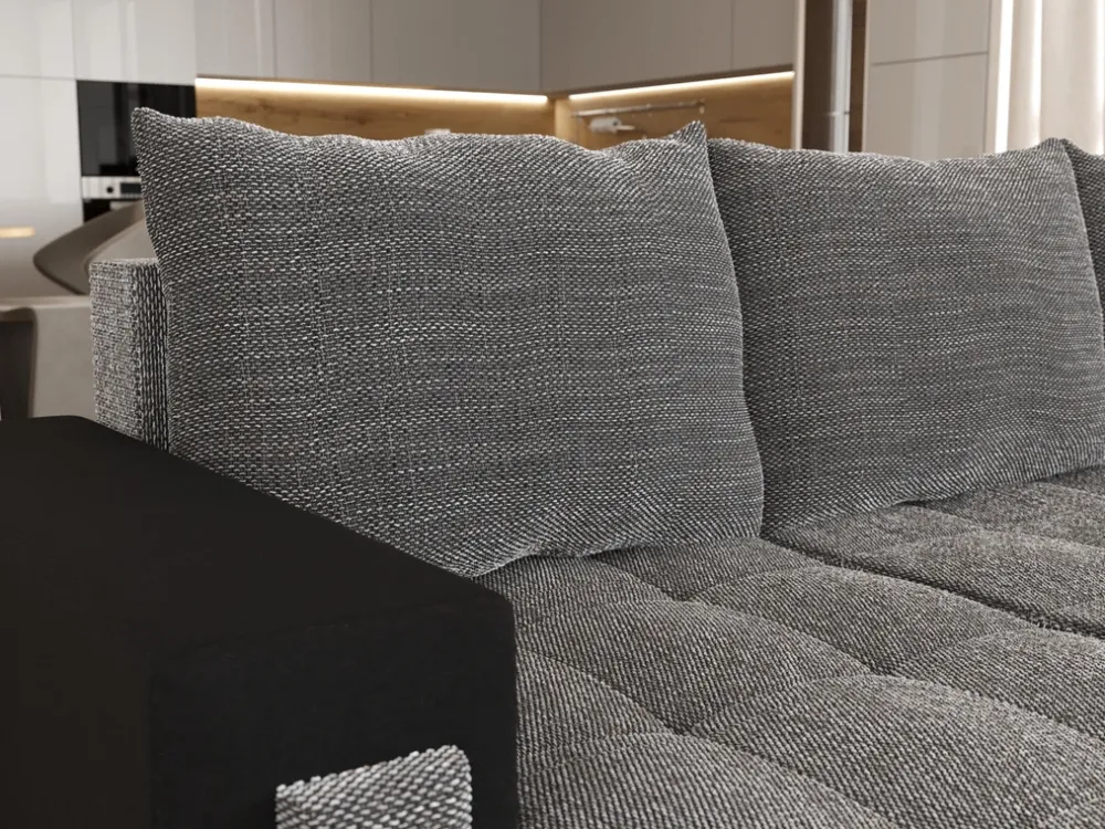 Dzięki funkcji spania narożnik U z łatwością zamienisz w duże, wygodne łóżko. Pojemny schowek na pościel pomoże utrzymać porządek, zapewniając dodatkowe miejsce do przechowywania.