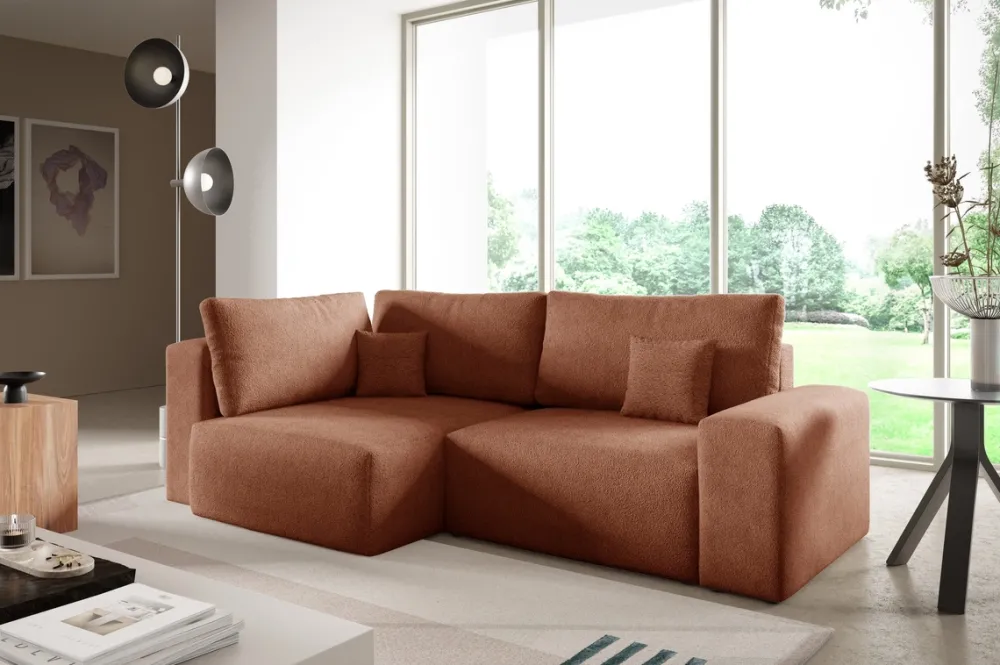 Nowoczesny narożnik z funkcją spania CAMILO DUO to idealne połączenie funkcjonalności i wyjątkowego designu, które wyróżnia się na tle innych mebli. Jest to mebel obity tkaniną boucle, co dodaje mu unikatowego charakteru i tekstury. Idealnie komponuje się zarówno w nowoczesnych, jak i bardziej klasycznych wnętrzach, będąc centralnym punktem salonu.