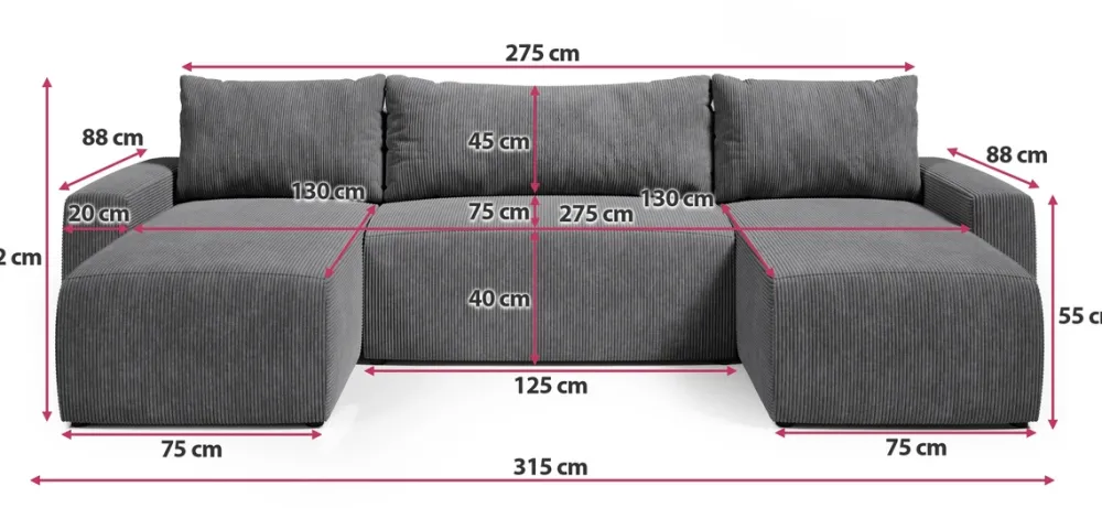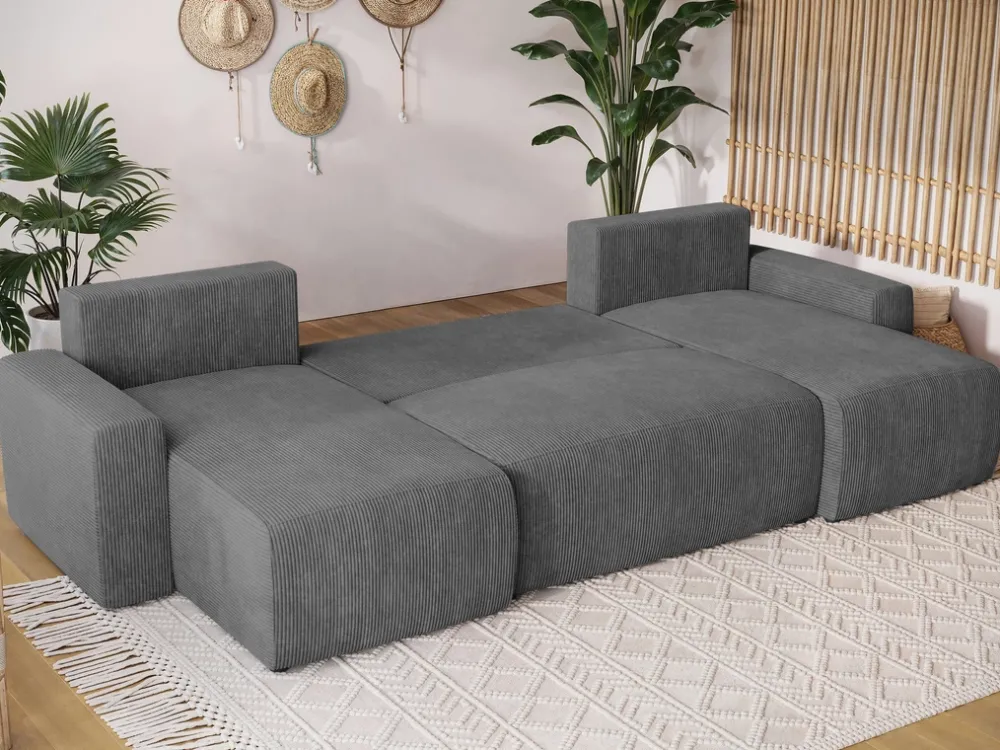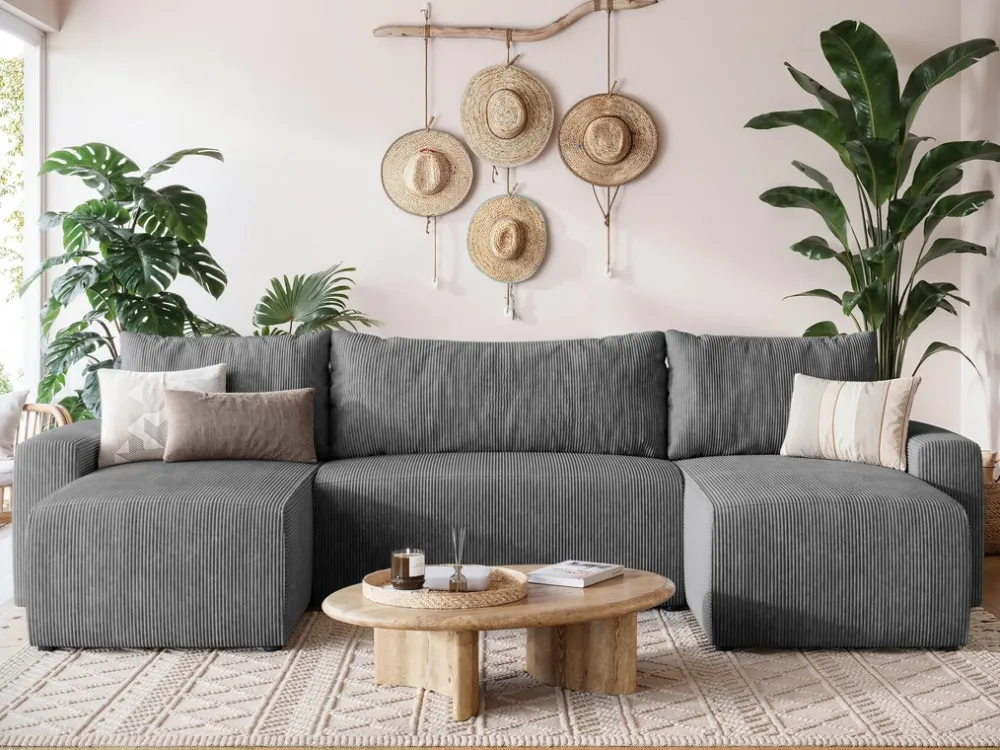 Narożnik w kształcie U z funkcją spania 125×275 cm PLUSH U to idealne rozwiązanie dla każdego, kto ceni sobie wygodę i praktyczność. Dzięki swojemu przemyślanemu designowi doskonale sprawdzi się zarówno w przestronnych salonach, jak i w mniejszych pomieszczeniach, oferując mnóstwo miejsca do siedzenia i spania.