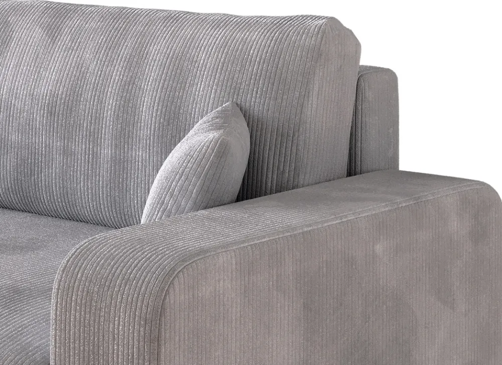 Sztruksowa tkanina to nie tylko trend, ale także synonim przytulności. Jej ciepła faktura i subtelny połysk wprowadzają do wnętrza wyjątkową atmosferę. Pojemnik na pościel ukryty pod siedziskiem ułatwia utrzymanie porządku, a funkcja spania sprawia, że narożnik doskonale sprawdzi się również w mniejszych przestrzeniach.
