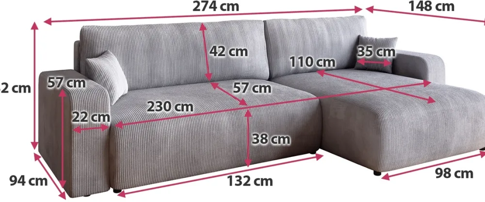 - Narożnik sztruksowy PUMI XL posiada funkcję spania o powierzchni 125×230 cm oraz głęboki pojemnik na pościel i poduszki pod siedziskiem. Siedzisko wykonano na bazie pianki PUR oraz sprężyn falistych. Grube poduchy gwarantują komfort oparcia.