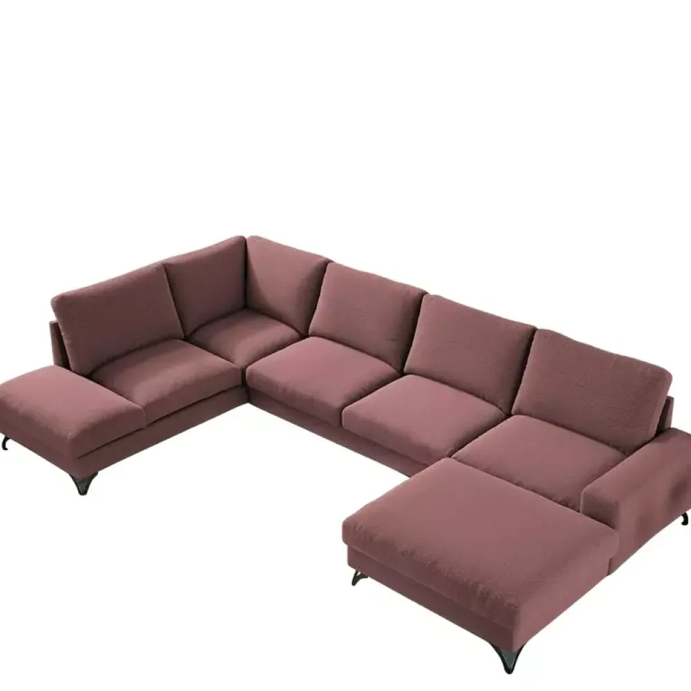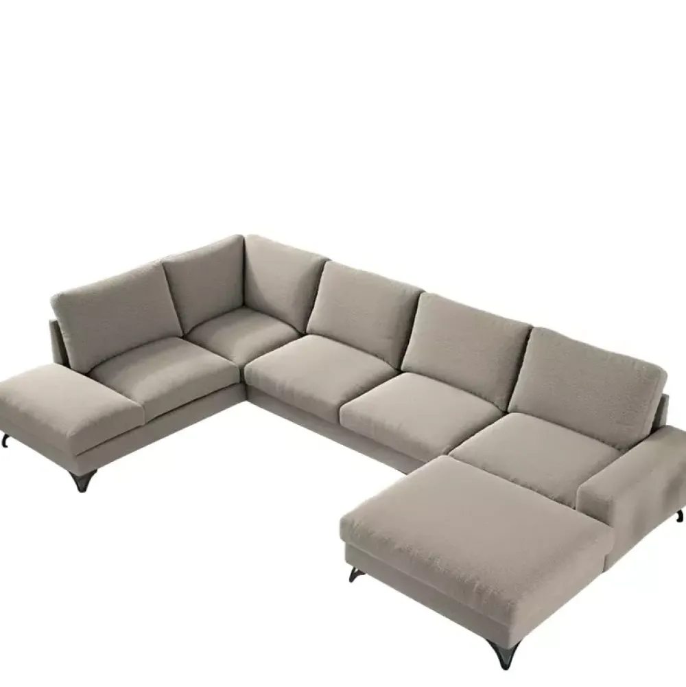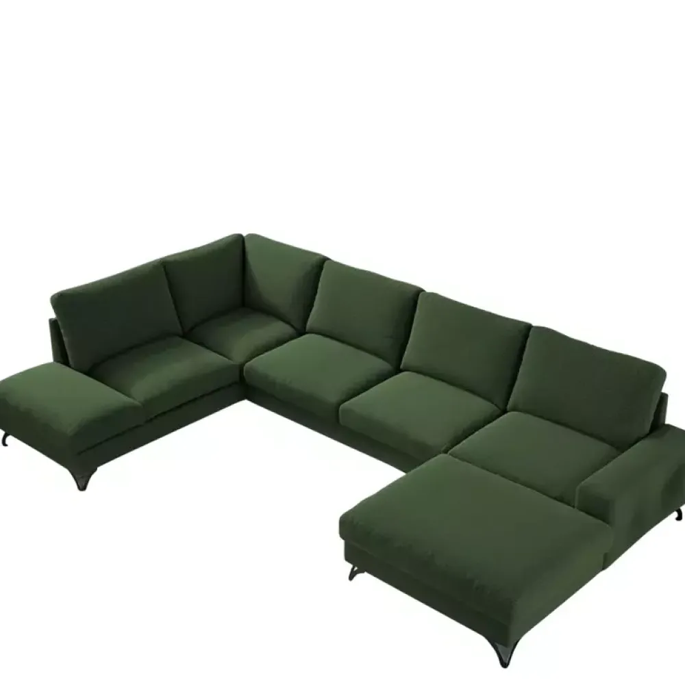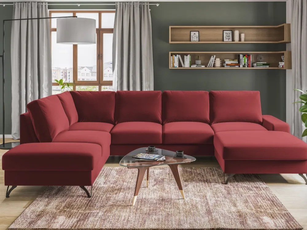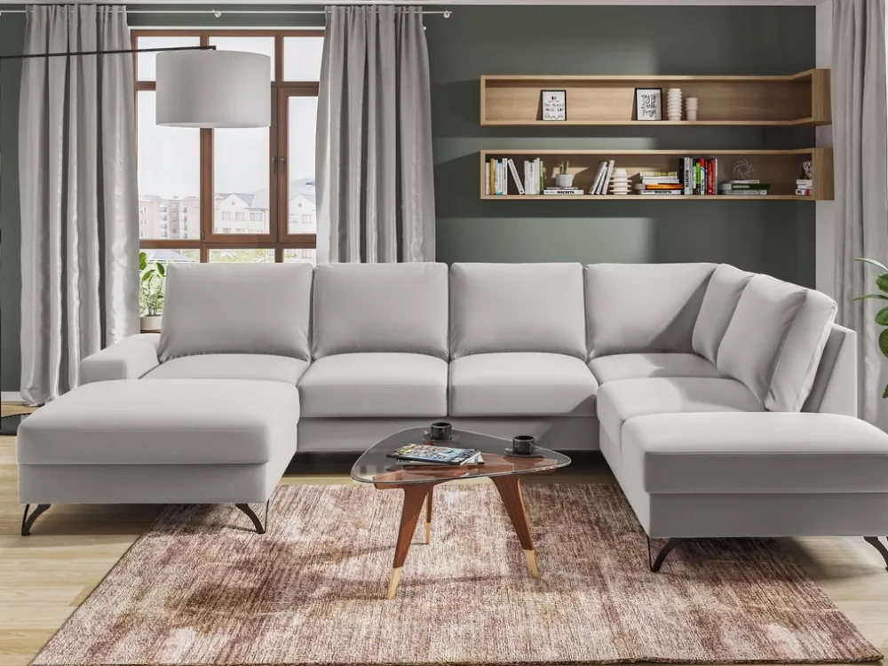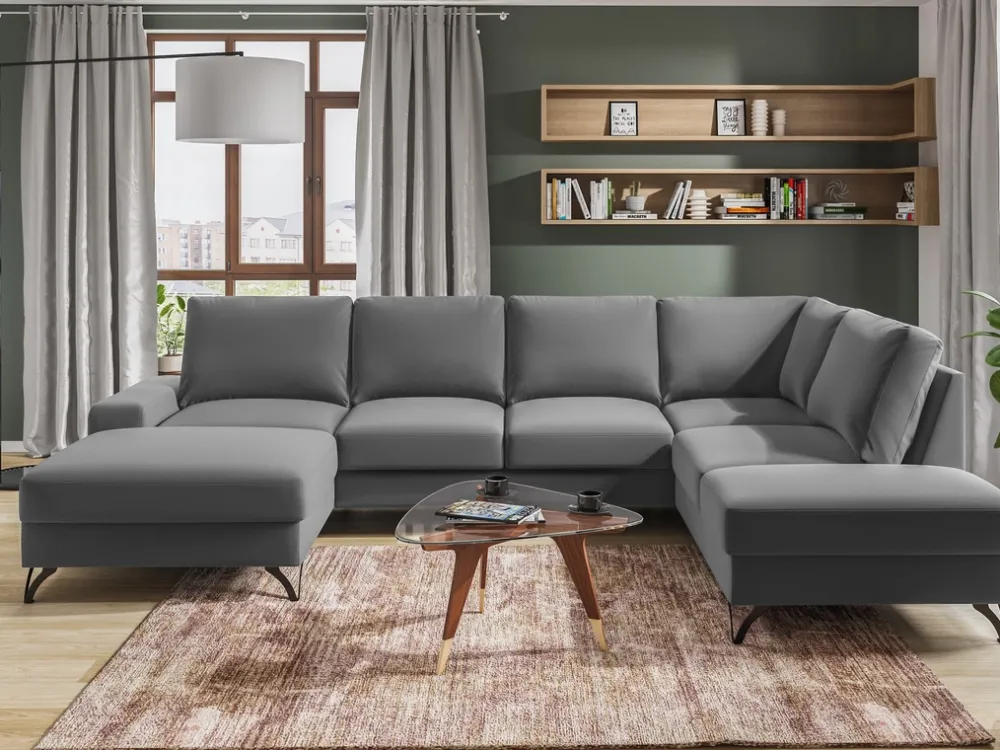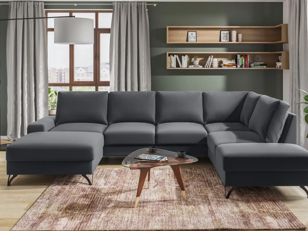 - Modułowy narożnik do nowoczesnego salonu. Narożnik tapicerowany w kształcie litery U. Ogromna powierzchnia spania o wymiarach aż 120 × 306 cm została uzupełniona dwoma obszernymi pojemnikami na pościel.