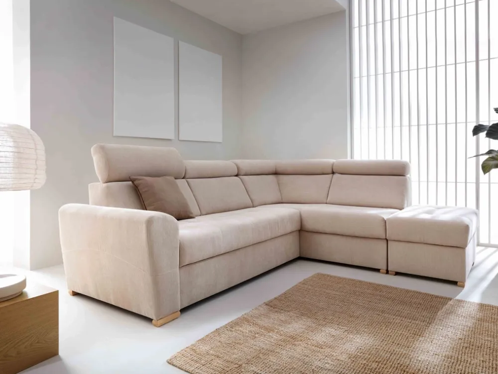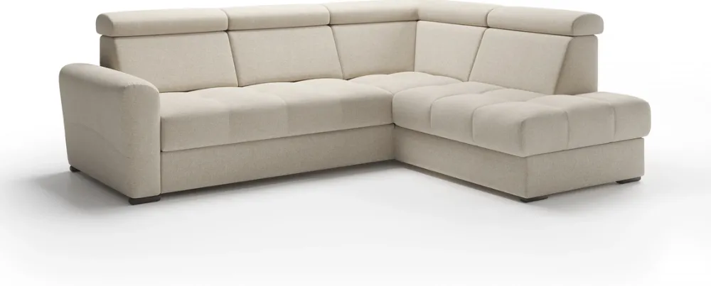 Narożnik z serii RIVA został wyposażony w funkcję spania oraz pojemnik na pościel, dzięki czemu zyskasz dodatkowe miejsce do spania dla gości, którzy po długiej podróży będą mogli sobie pozwolić na komfortowy sen. Wykonanie siedziska z połączenia dwóch elastycznych i odpornych na odkształcenia pianek, pod którymi znajdują się sprężyny faliste w połączeniu z regulowanymi zagłówkami zapewnia wysoki poziom komfortu podczas wypoczynku. Narożnik dostępny jest w wielu wariantach wysokiej jakości tkanin. Wybierz kolor i dopasuj narożnik do aranżacji własnego pomieszczenia.