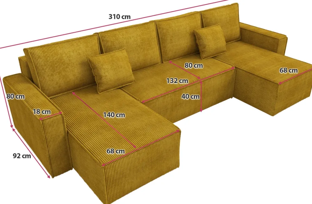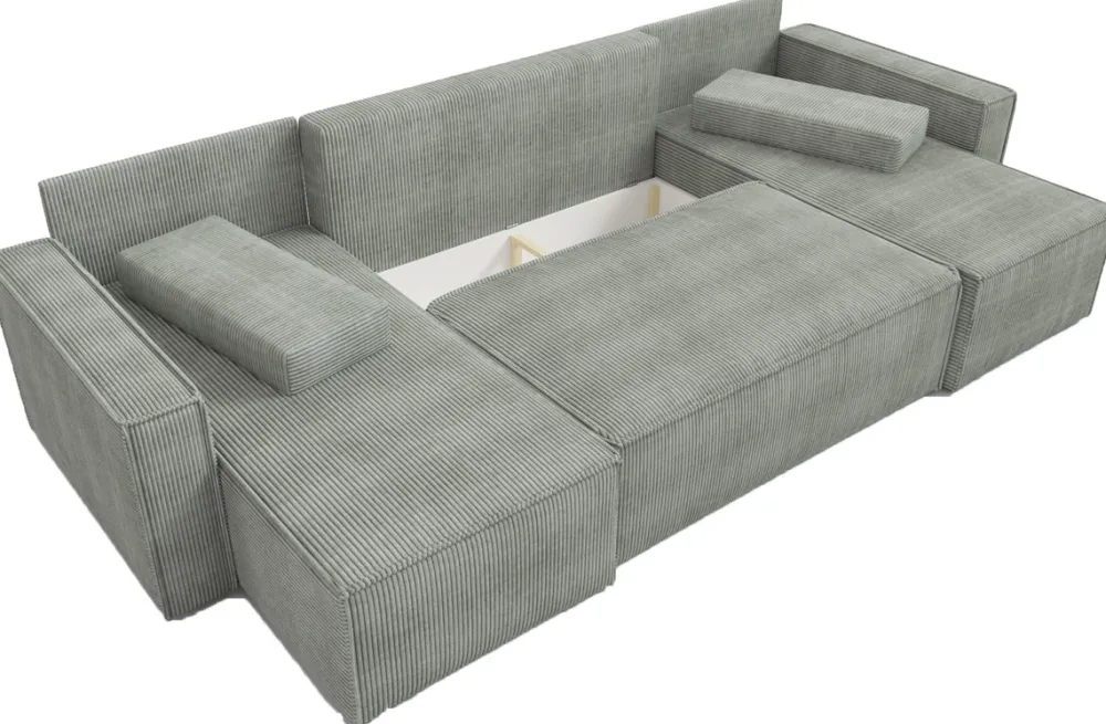 - Sztruksowy narożnik DEXTER U posiada funkcję spania z automatem sprężynowym o wymiarze 138×268 cm, która pozwala na okazjonalny sen dla dwóch osób. Pod siedziskiem narożnika znajduje się głęboki pojemnik na koce i poduszki. Wiele dostępnych kolorów.
