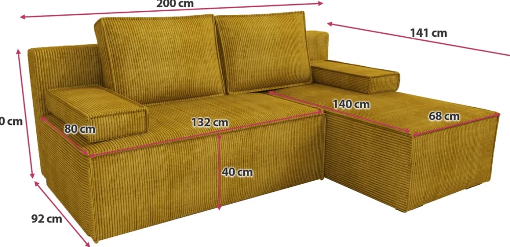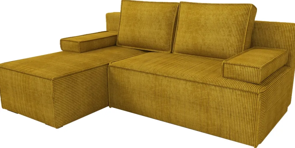 Narożnik tapicerowany jest tkaniną sztruksową, która wyróżnia się miękkością i charakterystyczną prążkowaną strukturą. Sztruks nie tylko dodaje narożnikowi elegancji, ale także jest wytrzymały i odporny na codzienne użytkowanie. Dzięki temu narożnik nie tylko świetnie wygląda, ale również zapewnia długotrwały komfort. Sztruksowa tapicerka wprowadza do wnętrza przytulność, która podkreśla nowoczesny charakter mebla.