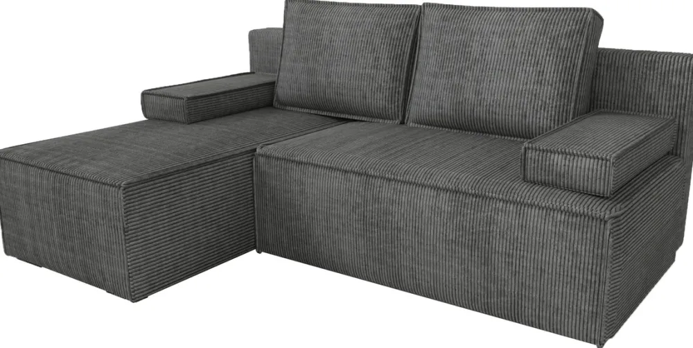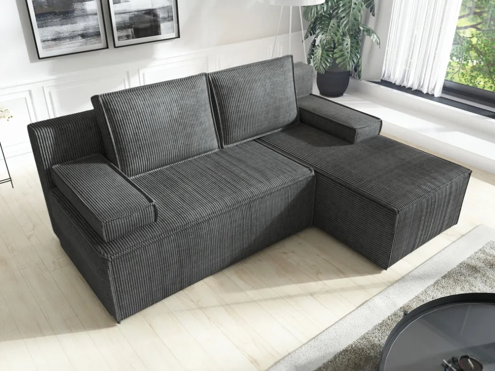 Narożnik tapicerowany jest tkaniną sztruksową, która wyróżnia się miękkością i charakterystyczną prążkowaną strukturą. Sztruks nie tylko dodaje narożnikowi elegancji, ale także jest wytrzymały i odporny na codzienne użytkowanie. Dzięki temu narożnik nie tylko świetnie wygląda, ale również zapewnia długotrwały komfort. Sztruksowa tapicerka wprowadza do wnętrza przytulność, która podkreśla nowoczesny charakter mebla.
