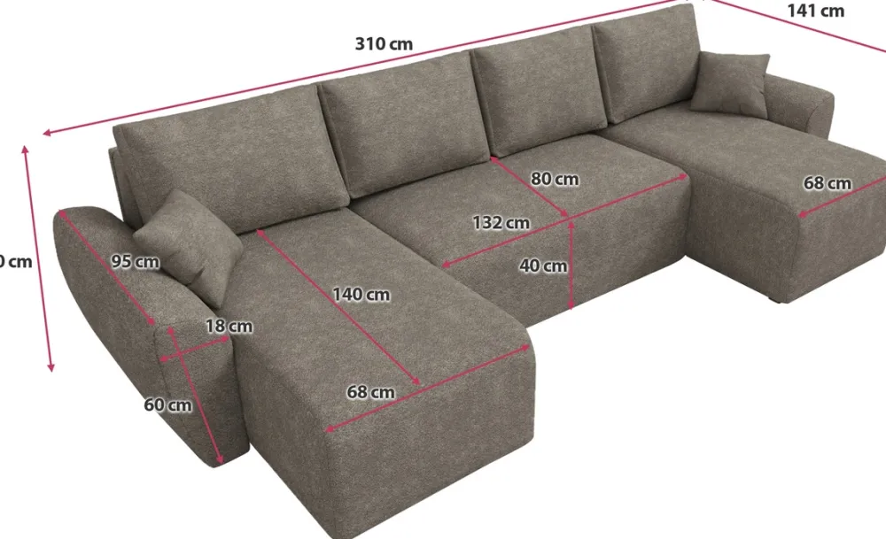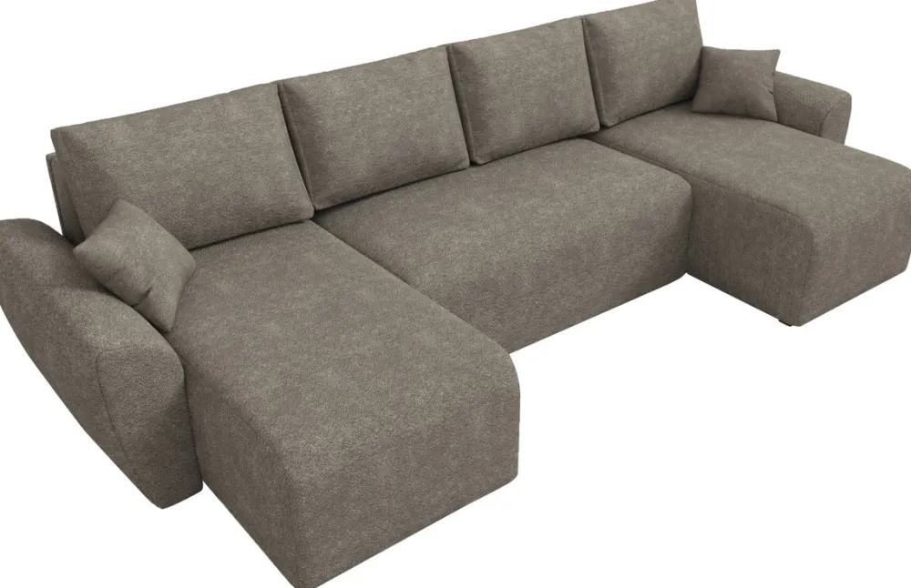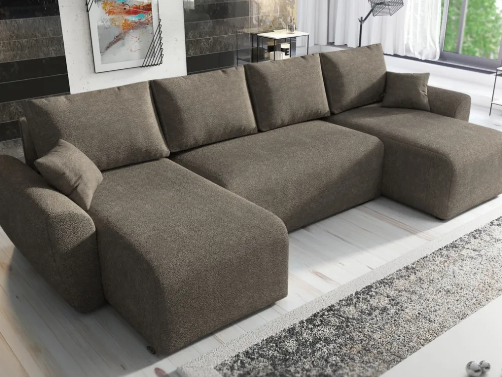 - Narożnik boucle do salonu ROTTERDAM U posiada funkcję spania o powierzchni 138×268 cm, która rozkładana jest za pomocą sprężynowego automatu DL. Pod siedziskiem znajduje się pojemnik na pościel. Narożnik w tkaninie boucle dostępnej w wielu kolorach.