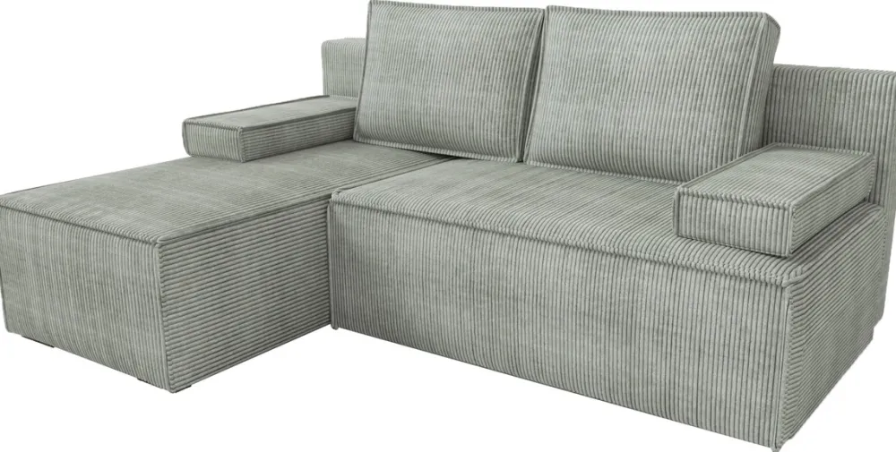 Narożnik tapicerowany jest tkaniną sztruksową, która wyróżnia się miękkością i charakterystyczną prążkowaną strukturą. Sztruks nie tylko dodaje narożnikowi elegancji, ale także jest wytrzymały i odporny na codzienne użytkowanie. Dzięki temu narożnik nie tylko świetnie wygląda, ale również zapewnia długotrwały komfort. Sztruksowa tapicerka wprowadza do wnętrza przytulność, która podkreśla nowoczesny charakter mebla.
