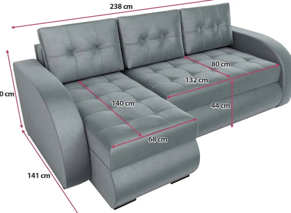 - Funkcja spania o powierzchni 138 × 200 cm pozwala na komfortowy sen dla gości lub relaksująca drzemkę w ciągu dnia. Narożnik rozkładany jest „na kółkach„, który wspomaga unoszenie siedziska ku górze.