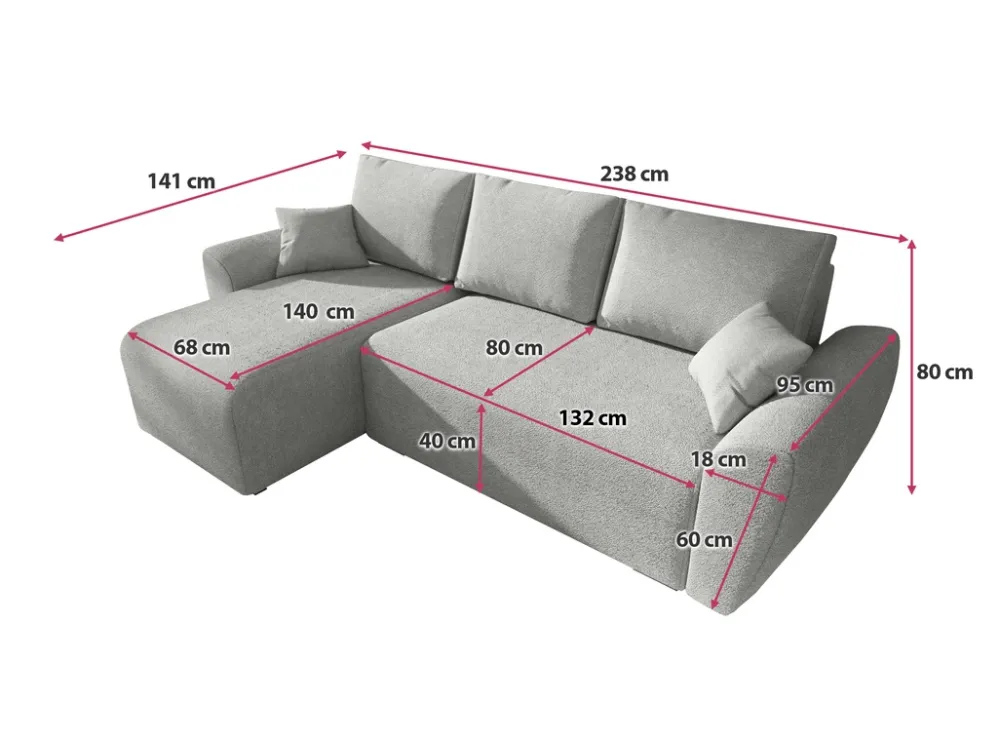 - Funkcja spania o powierzchni 138 × 200 cm pozwala na komfortowy sen dla gości lub relaksująca drzemkę w ciągu dnia. Narożnik rozkładany jest za pomocą sprężynowego automatu DL, który wspomaga unoszenie siedziska ku górze.
