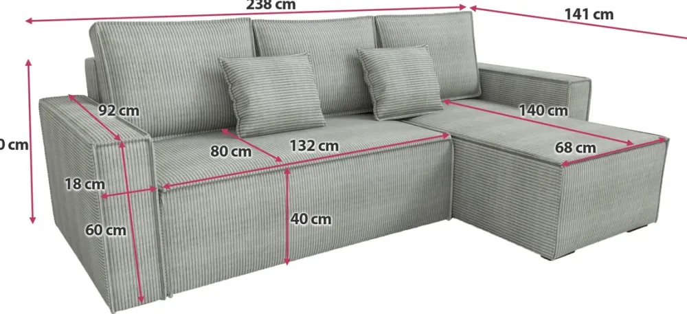 - Sztruksowy narożnik DEXTER posiada funkcję spania o wymiarze 138×200 cm, która pozwala na okazjonalny sen dla gości. Pod siedziskiem znajduje się głęboki pojemnik na poduszki i koce. Narożnik jest dostępny w wielu atrakcyjnych kolorach.