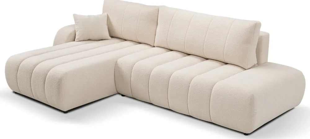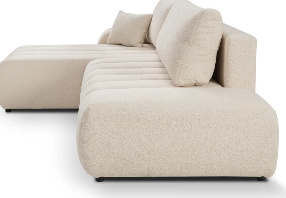 Obity tkaniną typu baranek Lambi, narożnik BLISS to esencja przytulności. Miękka, strukturalna faktura tkaniny w odcieniu beżu wprowadza ciepło i harmonię do wnętrza, czyniąc go idealnym miejscem na chwilę relaksu po długim dniu. Dwie duże poduszki oparciowe i uroczy jaśmin zapewniają wygodę, a ozdobne przeszycia dodają elegancji.