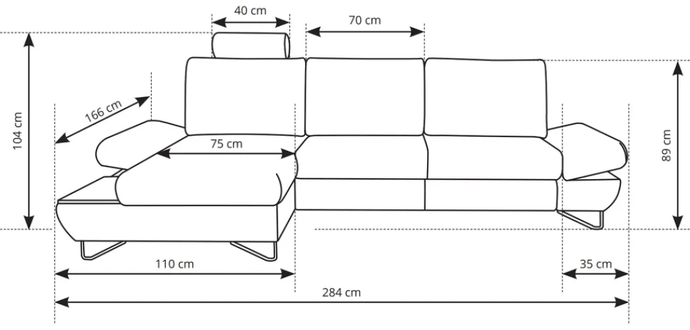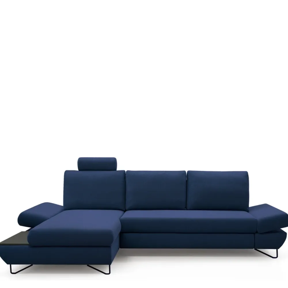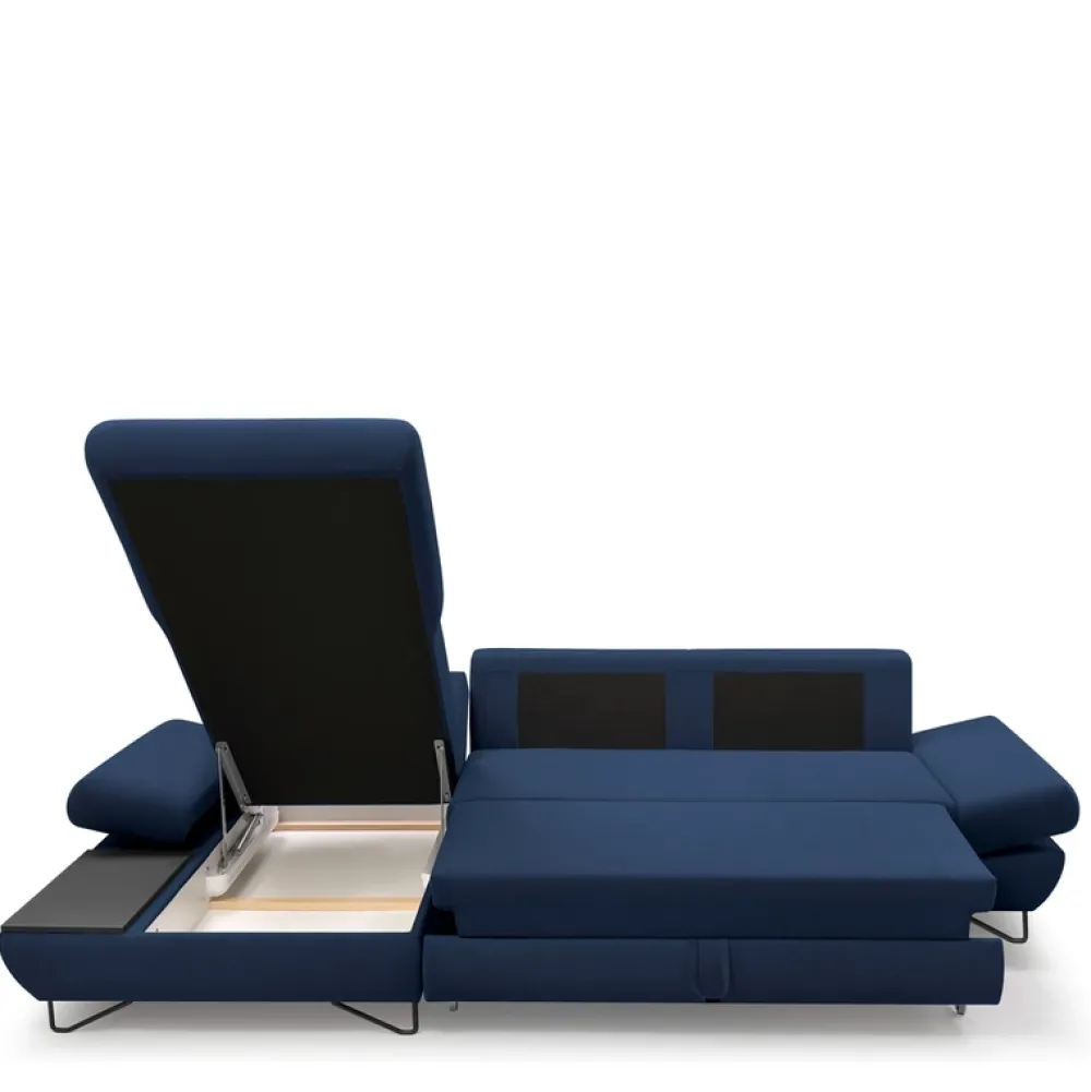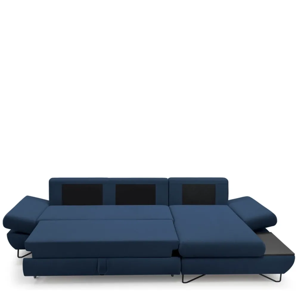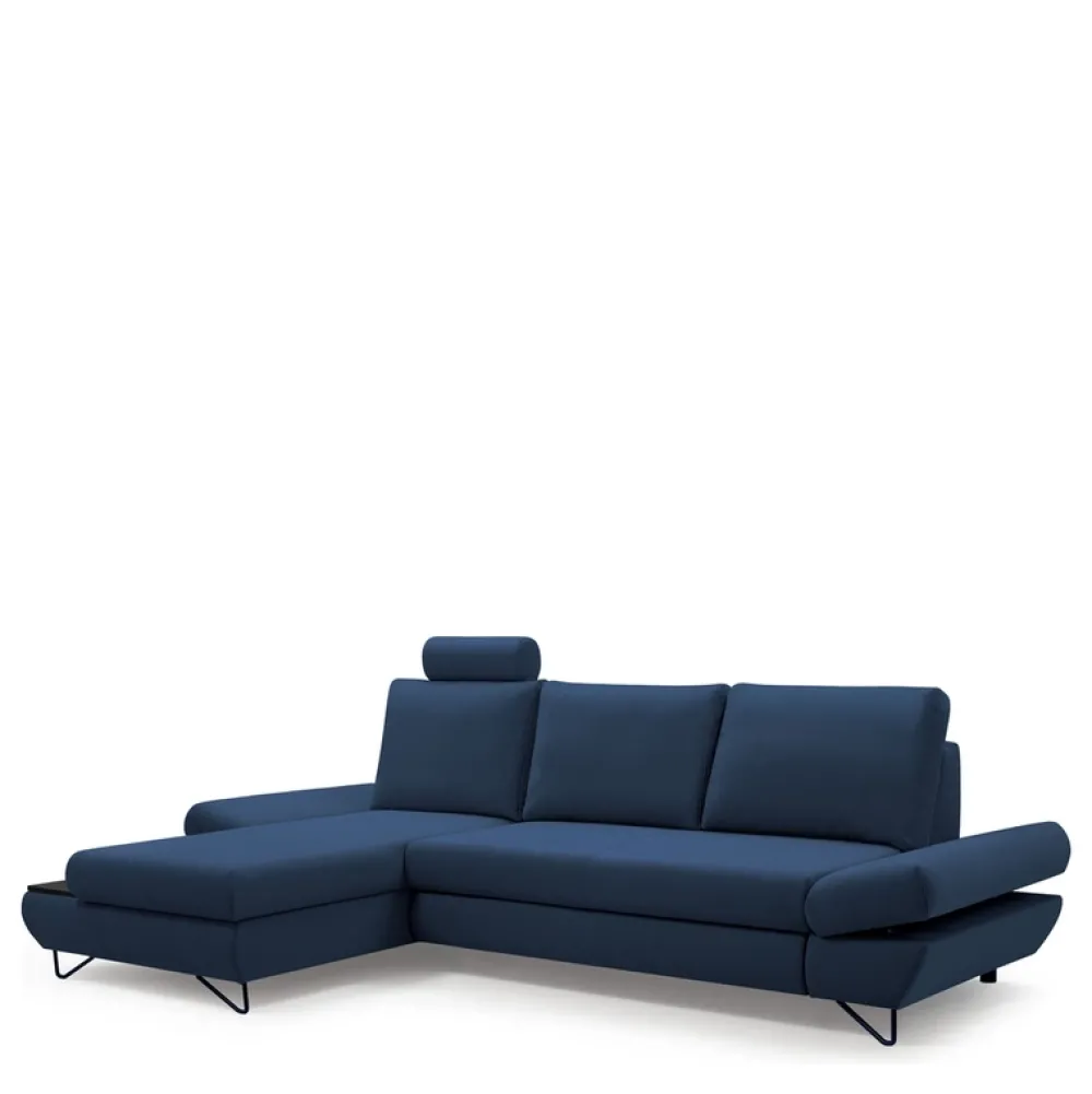 - Narożnik z funkcją spania LORENS wyróżnia się regulowanymi podłokietnikami, trzema poduchami oparciowymi oraz półką z boku otomany. Design kanapy narożnej podkreślają wysokie metalowe nóżki. W otomanie znajduje się głęboki pojemnik na pościel.