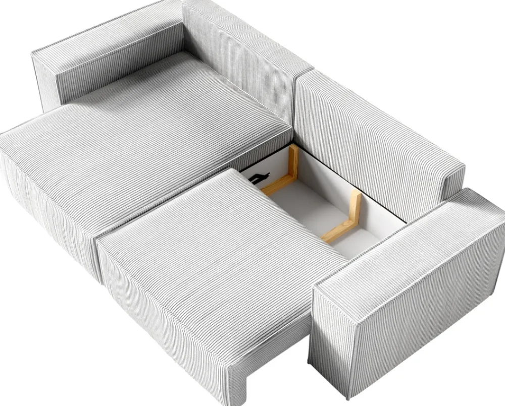 - Pod siedziskiem znajduje się pojemnik na pościel, idealny do przechowywania poduszek, koców czy innych akcesoriów, dzięki czemu łatwo utrzymać porządek w salonie.