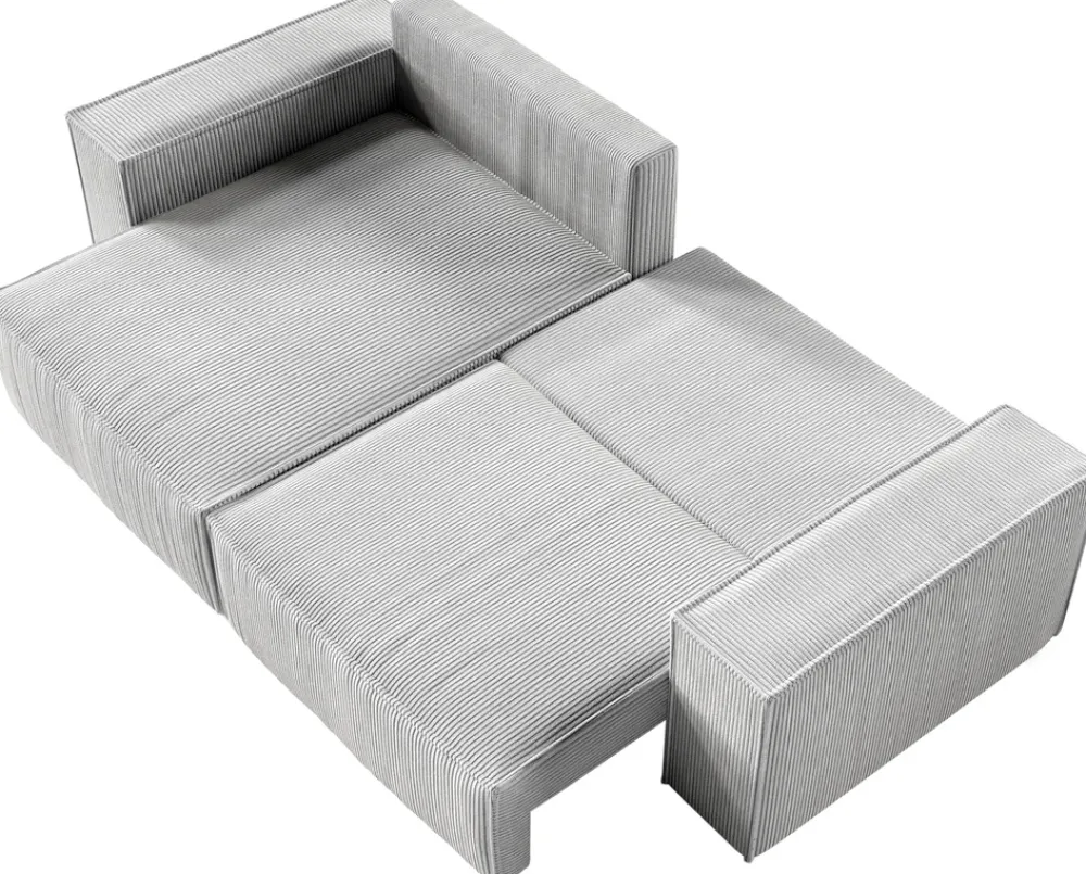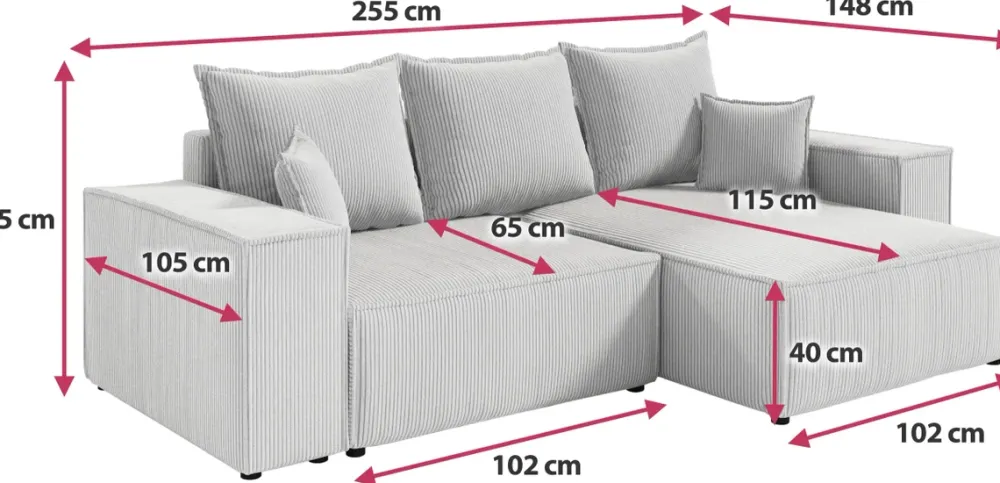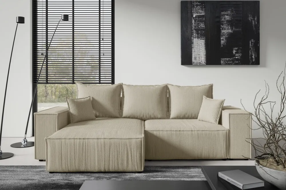 Sztruksowy narożnik rozkładany ELDON to elegancka i funkcjonalna propozycja do salonu, która doskonale łączy wygodę z nowoczesnym designem. Dzięki funkcji spania o wymiarach 135×204 cm ten mebel szybko przekształca się w wygodne miejsce do snu, idealne na nocowanie gości czy regenerującą drzemkę. Pod siedziskiem znajduje się praktyczny pojemnik na pościel, który pozwala na łatwe i estetyczne przechowywanie poduszek, koców czy innych tekstyliów.