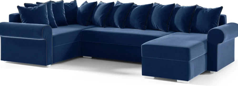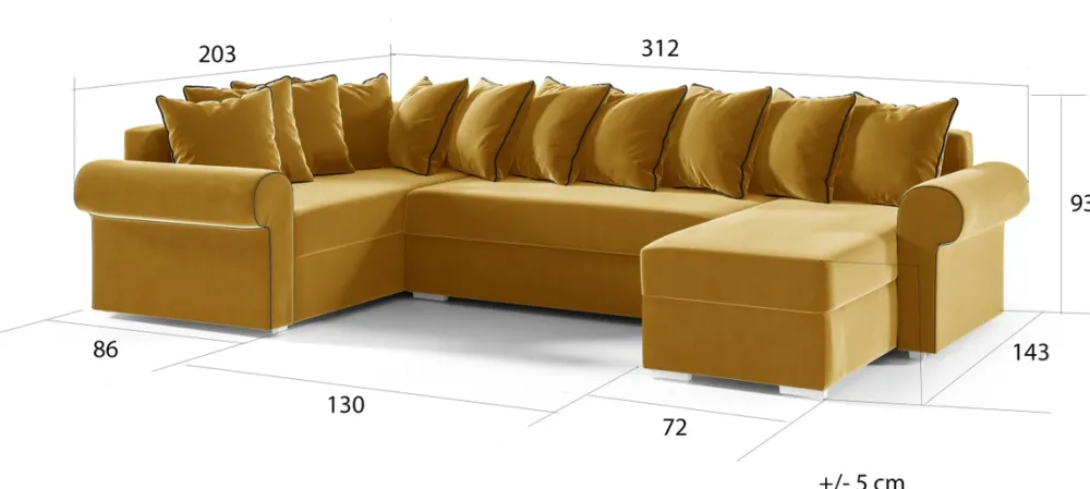 - Narożnik w kształcie U SOFINO posiada siedzisko oraz oparcie na bazie sprężyn bonell oraz pianki T-25. Funkcja spania o powierzchni 126×274 cm rozkładana jest za pomocą automatu DL. Narożnik posiada 11 poduszek, które dołączamy w zestawie.