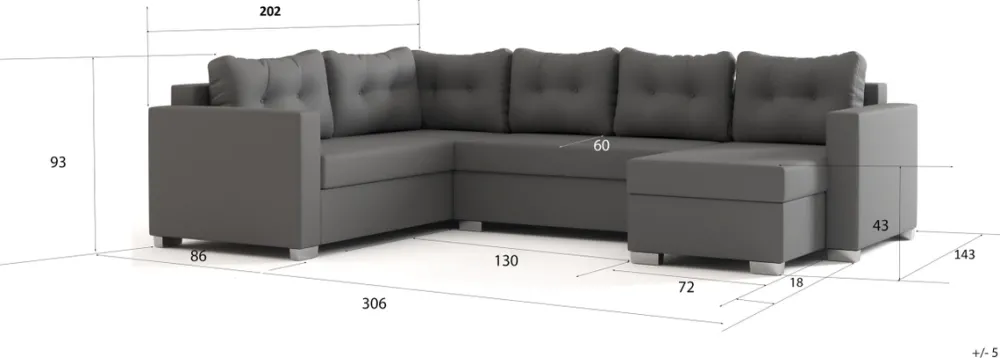 - Narożnik posiada również funkcję spania o wymiarach 126 x 274 cm, która zapewnia wygodne miejsce do okazjonalnego snu.