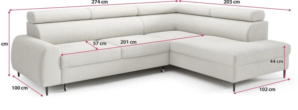 Nasz narożnik nie tylko oferuje wyjątkowy komfort, ale także jest niezwykle praktyczny. Dzięki głębokiemu pojemnikowi na pościel zapewniamy dodatkową przestrzeń do przechowywania, co jest idealne dla tych, którzy cenią sobie porządek i maksymalne wykorzystanie przestrzeni. Ponadto funkcja rozkładania typu delfin pozwala na łatwe i szybkie przekształcenie narożnika w wygodne miejsce do spania, idealne dla niespodziewanych gości. Regulowane zagłówki dają możliwość dostosowania do indywidualnych preferencji, zapewniając optymalny komfort i wsparcie.
