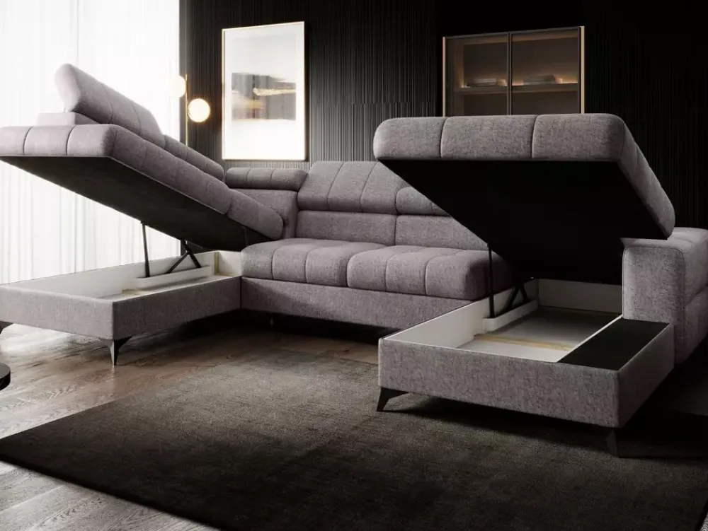 Częste wizyty gości przestaną być kłopotliwe dzięki funkcji spania, którą rozłożysz w parę chwil dzięki prostemu w obsłudze mechanizmowi typu Delfin. Natomiast o porządek z kołdrami czy poduszkami, zadbają dwa pojemniki na pościel znajdujące się pod otomanami.