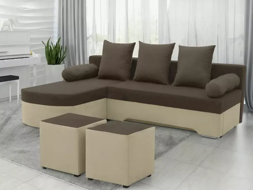 - Spraw by chwile spędzone w salonie były piękniejsze z nowoczesnym narożnikiem ANGELLO. Razem z meblem dołączone są dwie pufy, zapewniające dodatkowe miejsce do siedzenia oraz komplet poduch. Rogówka posiada również funkcję spania i pojemnik na pościel.