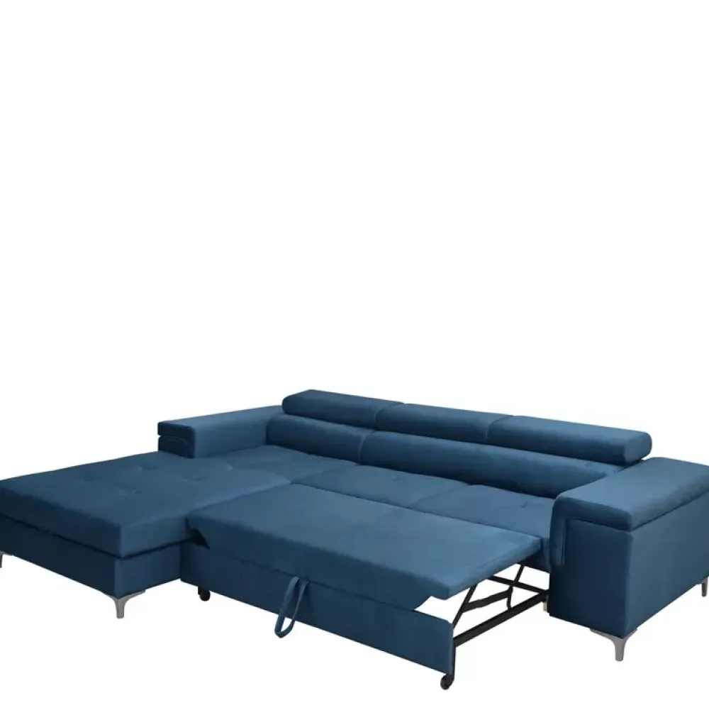- Kanapa narożna wyposażona w niezwykle praktyczny pojemnik na pościel, który w tym modelu umieszczono pod wysuniętą leżanką.