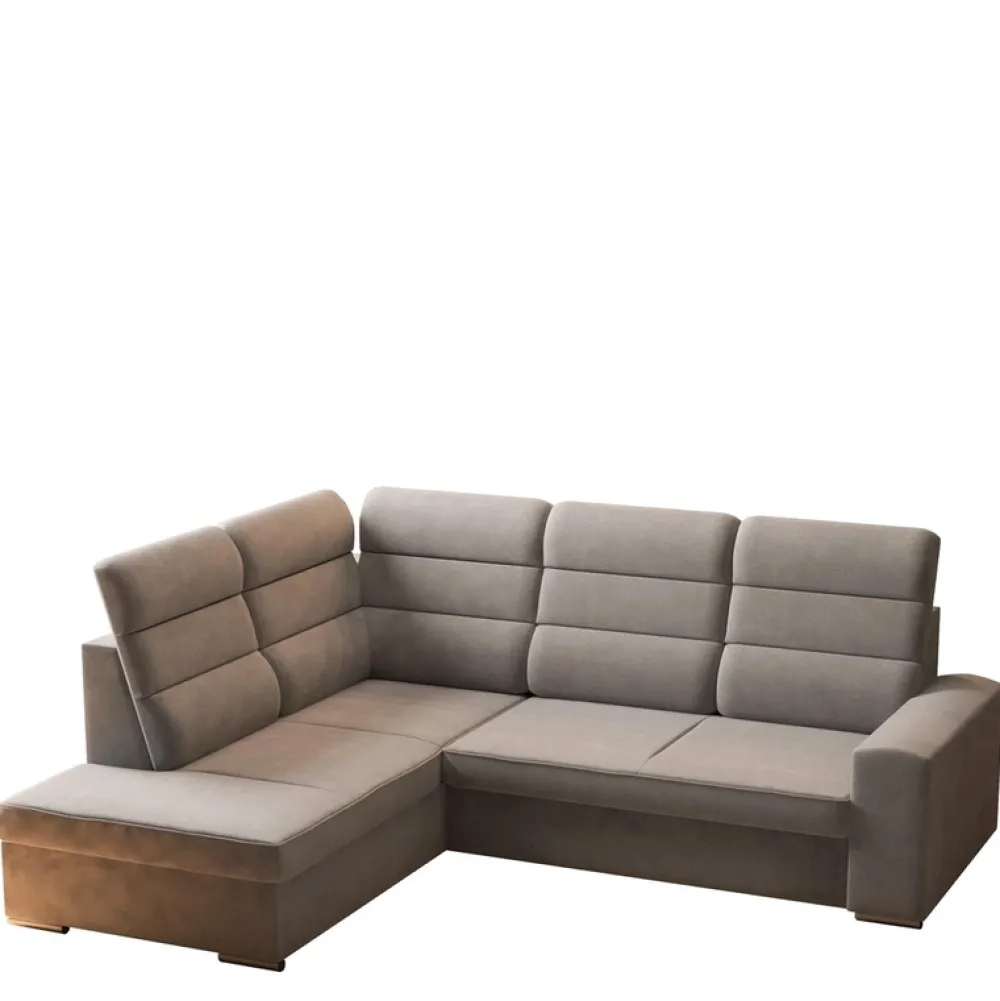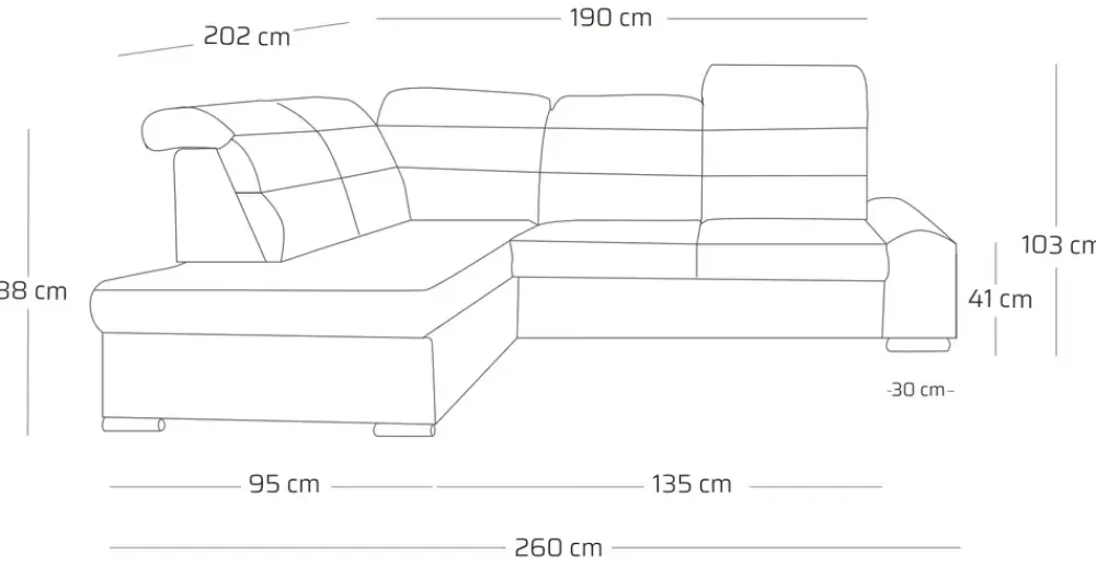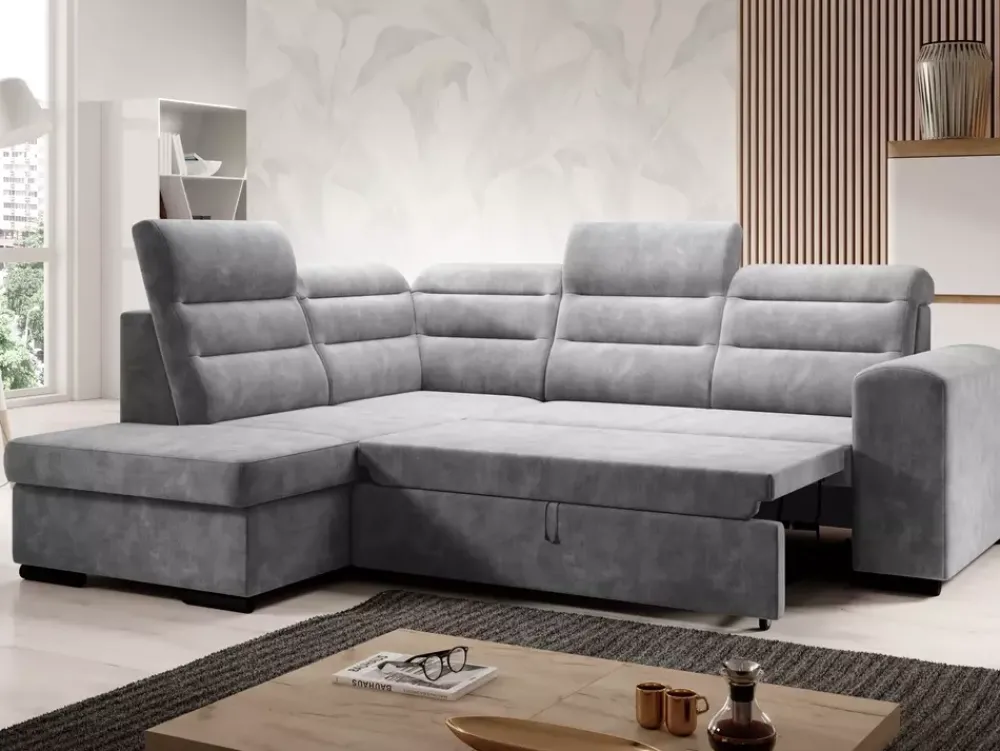 Funkcjonalność narożnika podkreśla także dostępna powierzchnia spania o wymiarach 120×190 cm, co czyni go doskonałym wyborem dla tych, którzy cenią sobie możliwość szybkiego i łatwego przekształcenia sofy w wygodne miejsce do spania.