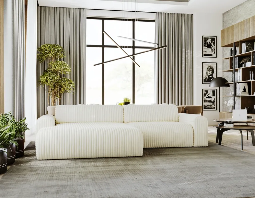 - Nowoczesny narożnik sztruksowy do salonu SEFO. Narożnik zaskoczy Cię wyjątkowym designem oraz wysokim komfortem. W siedzisku zastosowano piankę odporną na odkształcenia oraz sprężyny faliste. Narożnik obity futrową tkaniną Vito.