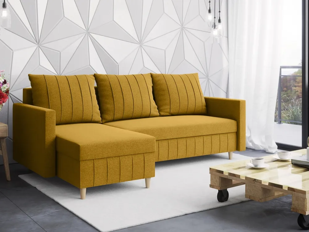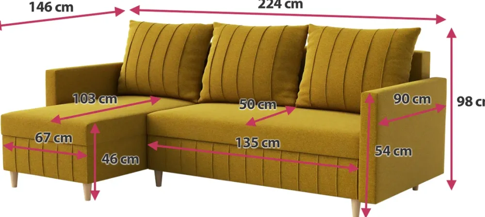 Montaż narożnika jest intuicyjny i szybki, dzięki czemu oszczędzasz czas i energię. Trzy duże poduchy zadbają o odpowiednie podparcie dla pleców podczas odpoczynku. Natomiast wysokie drewniane nóżki nie tylko stabilizują mebel, ale także podkreślają jego nowoczesny design oraz ułatwiają sprzątanie pod nim.