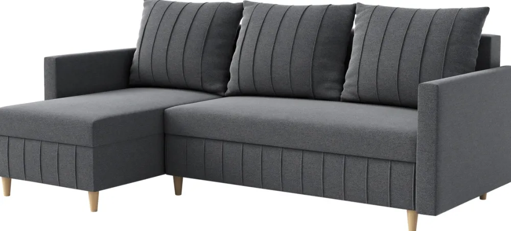 Montaż narożnika jest intuicyjny i szybki, dzięki czemu oszczędzasz czas i energię. Trzy duże poduchy zadbają o odpowiednie podparcie dla pleców podczas odpoczynku. Natomiast wysokie drewniane nóżki nie tylko stabilizują mebel, ale także podkreślają jego nowoczesny design oraz ułatwiają sprzątanie pod nim.