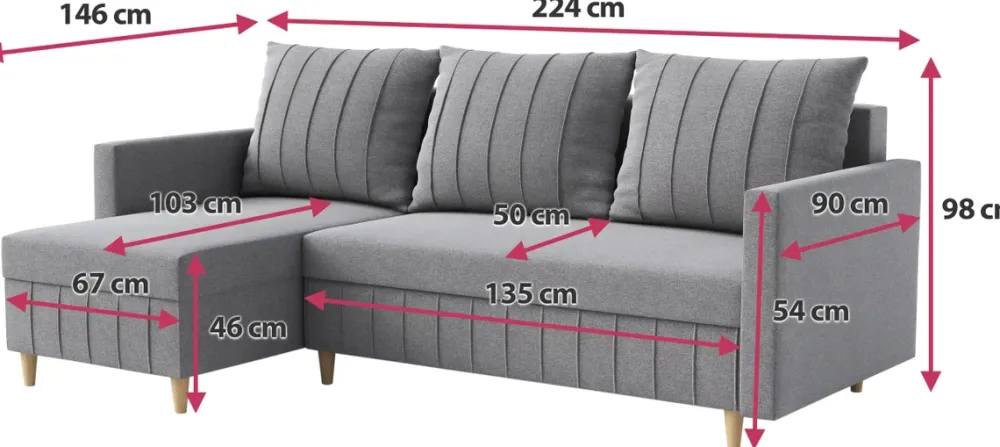 Montaż narożnika jest intuicyjny i szybki, dzięki czemu oszczędzasz czas i energię. Trzy duże poduchy zadbają o odpowiednie podparcie dla pleców podczas odpoczynku. Natomiast wysokie drewniane nóżki nie tylko stabilizują mebel, ale także podkreślają jego nowoczesny design oraz ułatwiają sprzątanie pod nim.