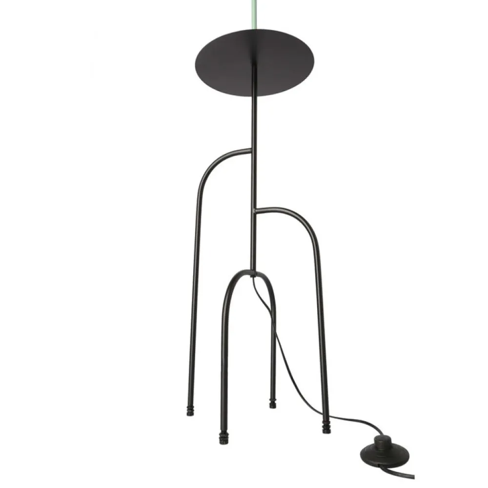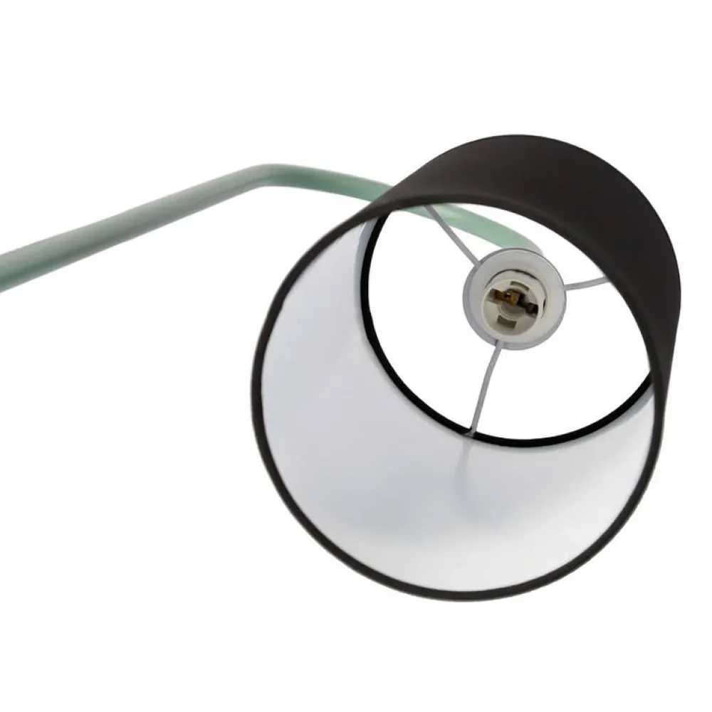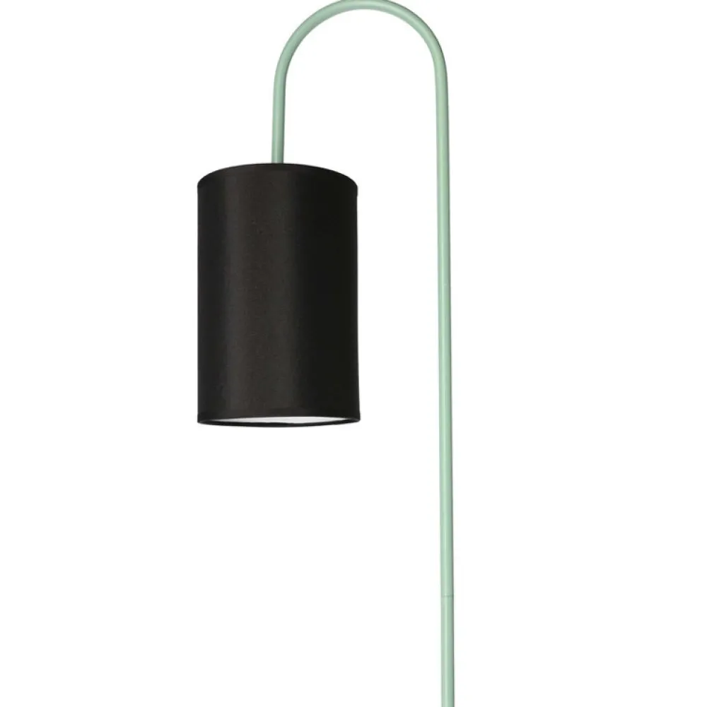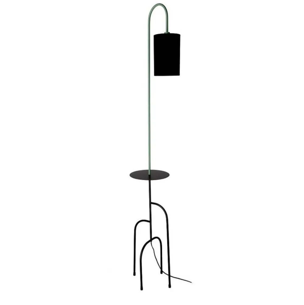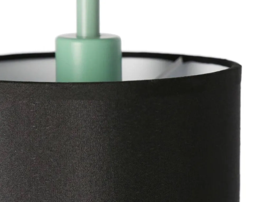 RAVELLO – lampa podłogowa na 4 nogach. Metalowa konstrukcja w kolorystyce czarno-miętowej, z półką w środkowej części. Abażur w kształcie walca z czarnej tkaniny wzmocnionej PCV.