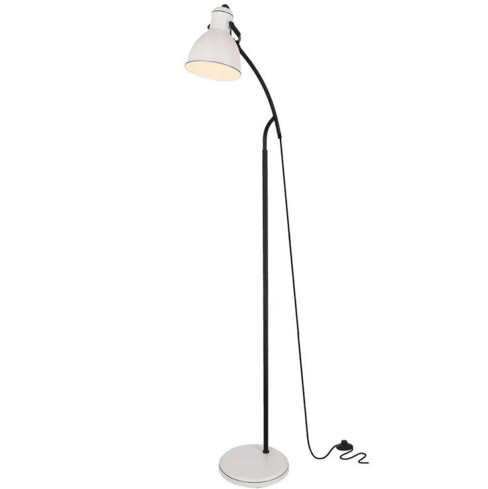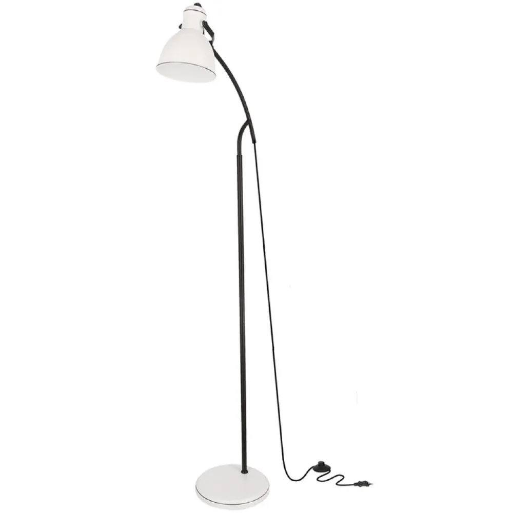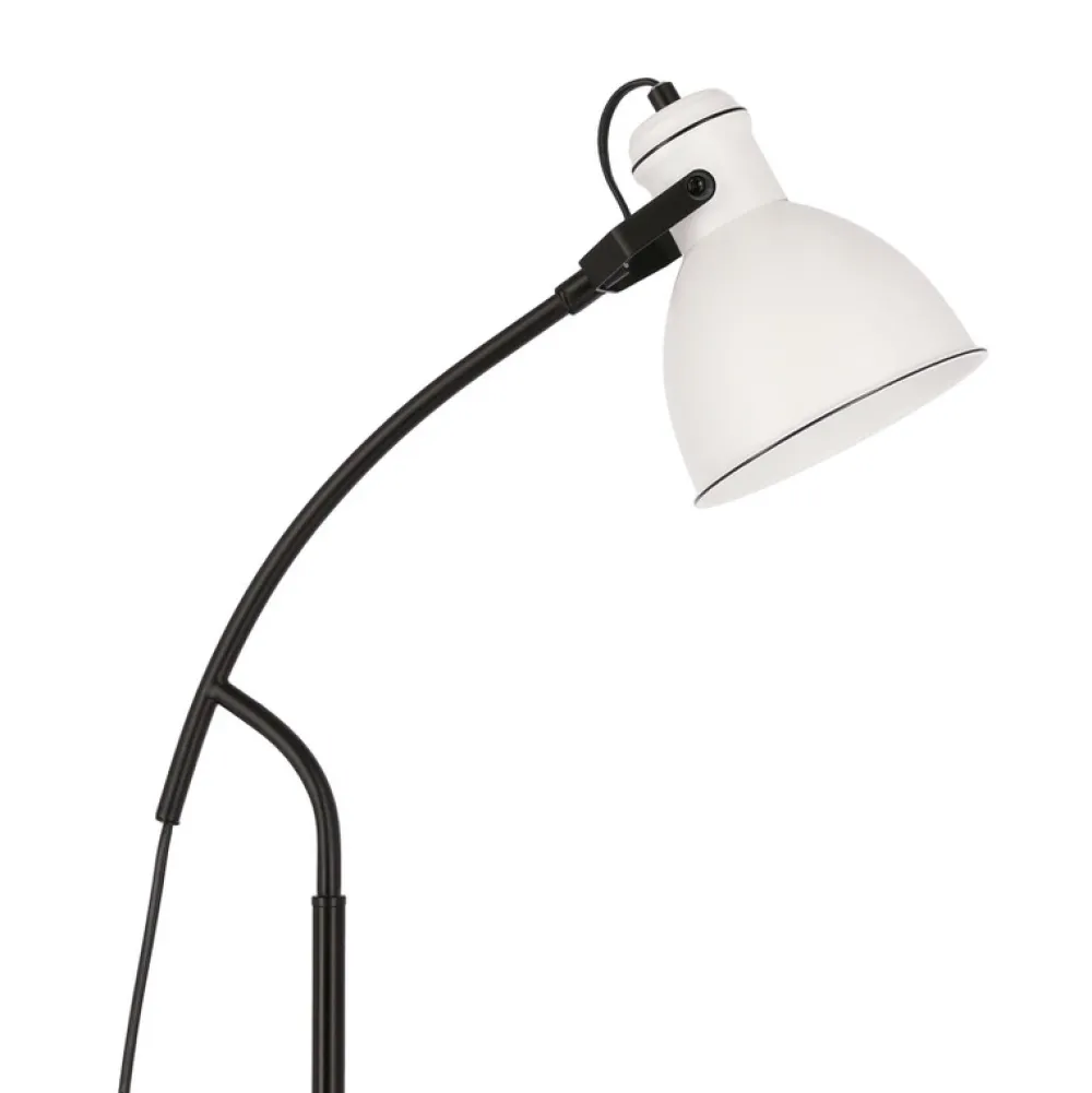 Nowoczesna lampa podłogowa Zumba złożona z dwuczłonowej, czarnej sztycy – w górnej części montowanej pod kątem i zakończonej metalowym kloszem w kolorze białym.