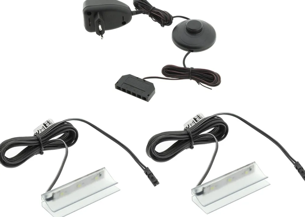 - Zestaw dwóch klipsów LED z zasilaczem oraz włącznikiem do podświetlenia półek szklanych w meblach w kolorze białym o barwie ciepłej.