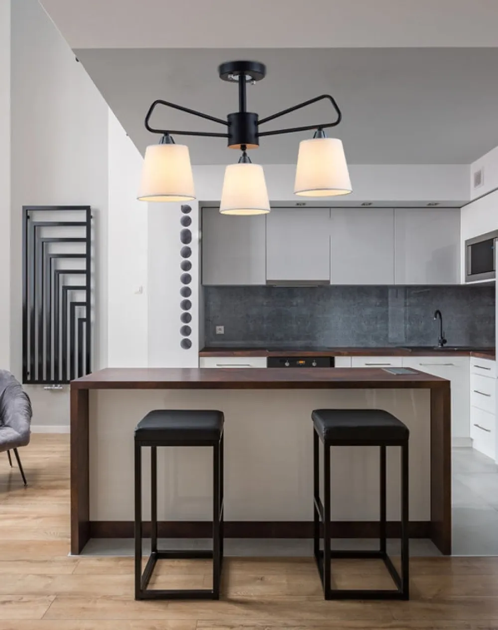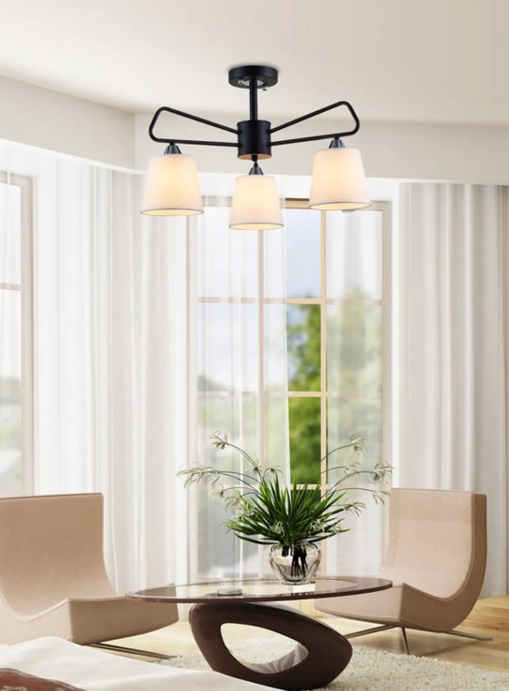 Rodzina klasycznych lamp wykonanych z czarnego metalu z białym, tkaninowym abażurem. Seria składa się z dwóch żyrandoli, kinkietu i lampy stołowej. Rodzina doskonale nadaje się do pomieszczeń takich jak: salon, sypialnia, jadalnia, gabinet. Uniwersalna stylistyka rodziny sprawia, że będzie ona dobrze się komponować zarówno w klasycznych, jak i nowoczesnych wnętrzach. Żyrandol z trzema punktami świetlnymi. Żarówka nie jest dołączona do produktów z zewnętrznym źródłem światła.