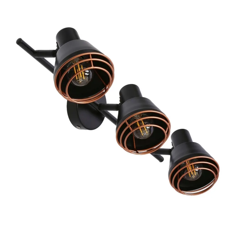 Nowoczesna lampa ścienna/sufitowa (spot) wykonana z metalu w kolorze czarnym wykończona miedzianym akcentem w postaci wianka. Lampa wyposażona jest w oprawkę E14, można zastosować żarówkę LED. Klosz lampy jest ruchomy, co umożliwia ustawienie strumienia światła w dowolnym kierunku. To doskonały przedstawiciel stylu industrialnego, zwanego też loftowym. Często i chętnie wykorzystywany do sypialni jako doświetlenie przy łóżku. Żarówka niedołączona do zestawu. Rodzina Neria składa się z kinkietu, lampy ściennej/sufitowej 2 i 3 punktowej oraz plafonu 3 punktowego.