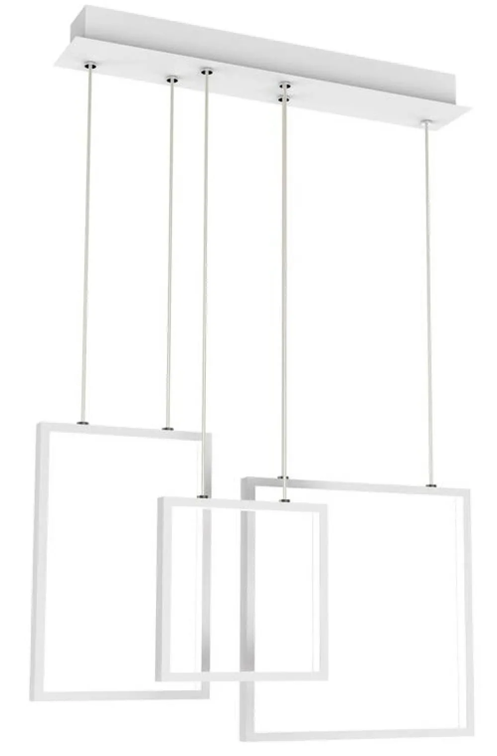 - Lampa wisząca o formie trzech kwadratów. Zawieszone na metalowych linkach dają złudzenie przywieszonych ramek na zdjęcia. Połączenie metalu o barwie białej i ledu daje pewność dopasowania się do każdego pomieszczenia, nadając obłędnego efektu.